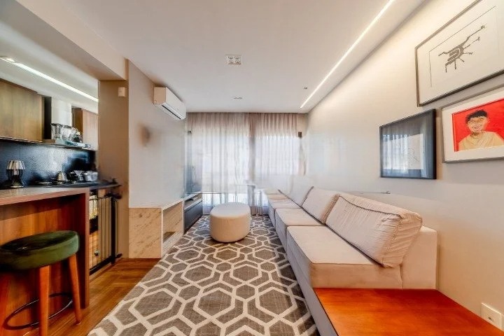 Apartamento com 100 m² privativos, composto por três dormitórios, sendo uma suíte com closet e sacada. Living para dois ambientes com lareira ecológica, hall com bar, cozinha americana com churrasqueira e fechadura digital. Imóvel mobiliado sob medida, com projeto de arquitetura, vista panorâmica, sol da manhã e duas vagas de garagem cobertas.