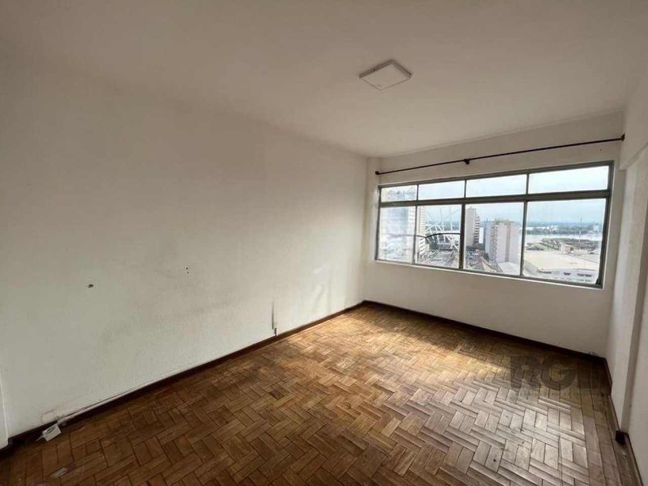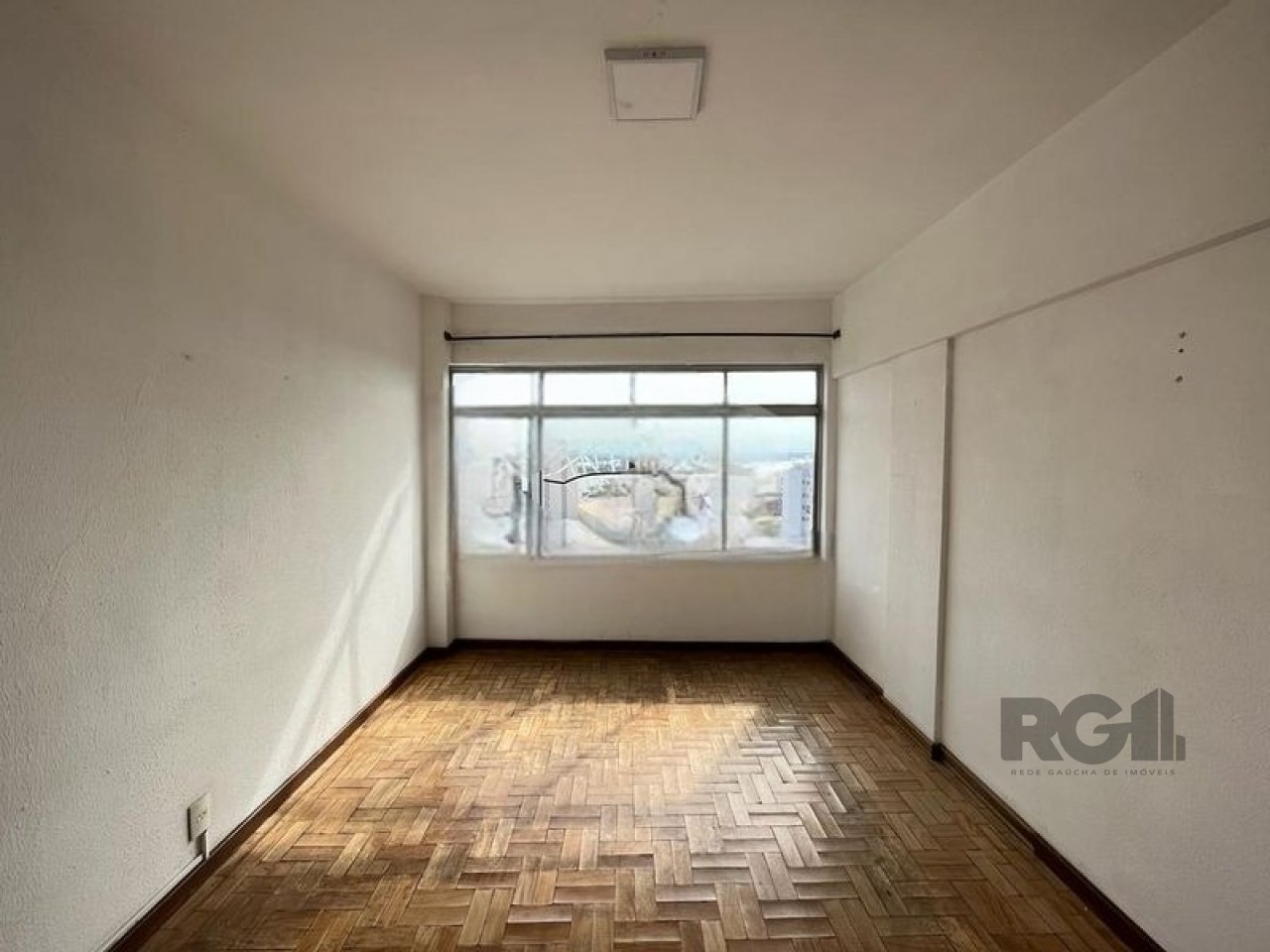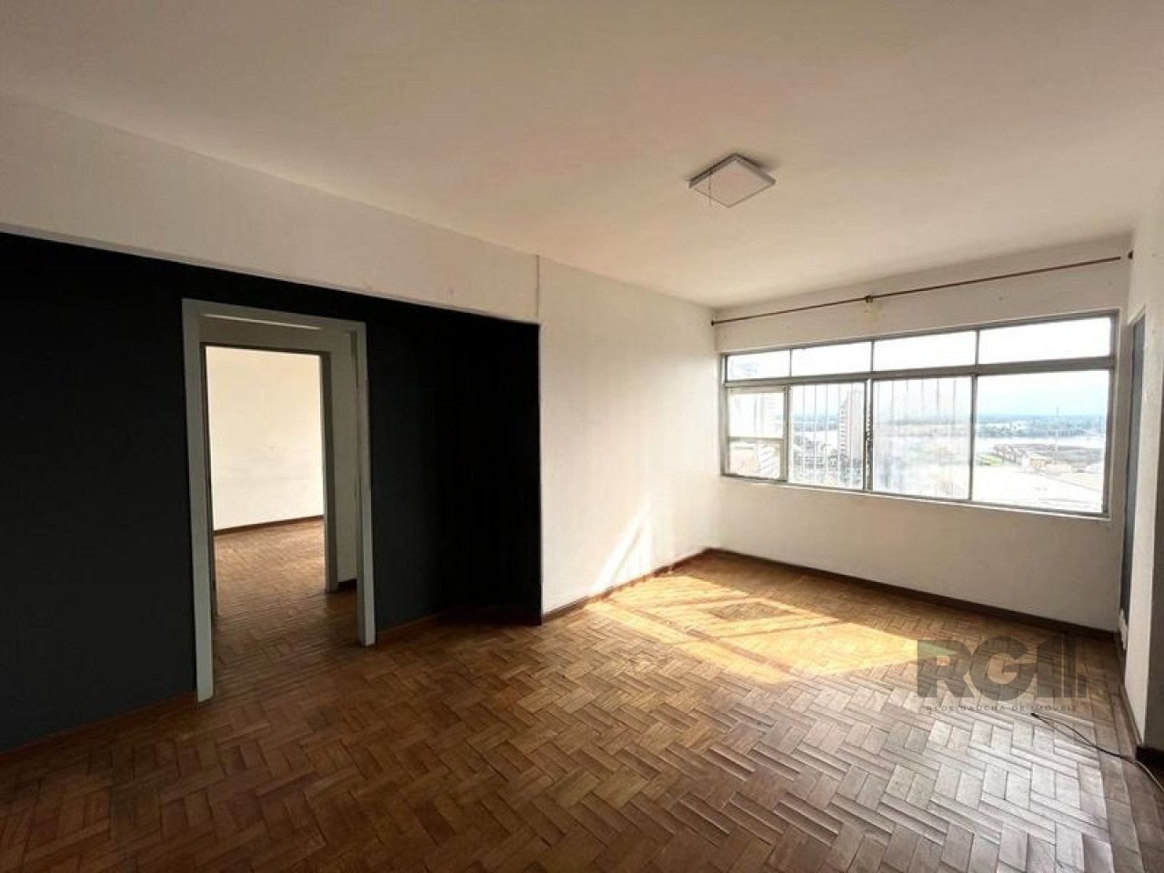 Apartamento com dois quartos, sala, banheiro, cozinha e área de serviço. Possui vista para o Guaíba, com boa entrada de luz e ventilação natural. A cozinha conta com armários fixos e piso em cerâmica, enquanto os demais ambientes têm piso em parquet.