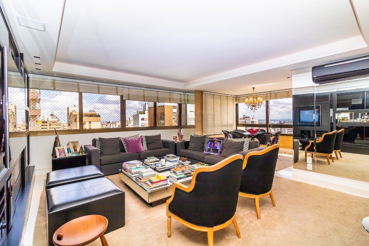Apartamento mobiliado e equipado, com 129m² privativos, em andar alto e vista panorâmica para o Guaíba, no bairro Bela Vista. Living para três ambientes, lavabo, espaço gourmet com churrasqueira e cozinha planejada. Área íntima com 1 suíte máster com closet e hidromassagem, além de 2 suítes americanas. Imóvel reformado, com ar-condicionado split, água quente, armários embutidos e 2 vagas individuais lado a lado.