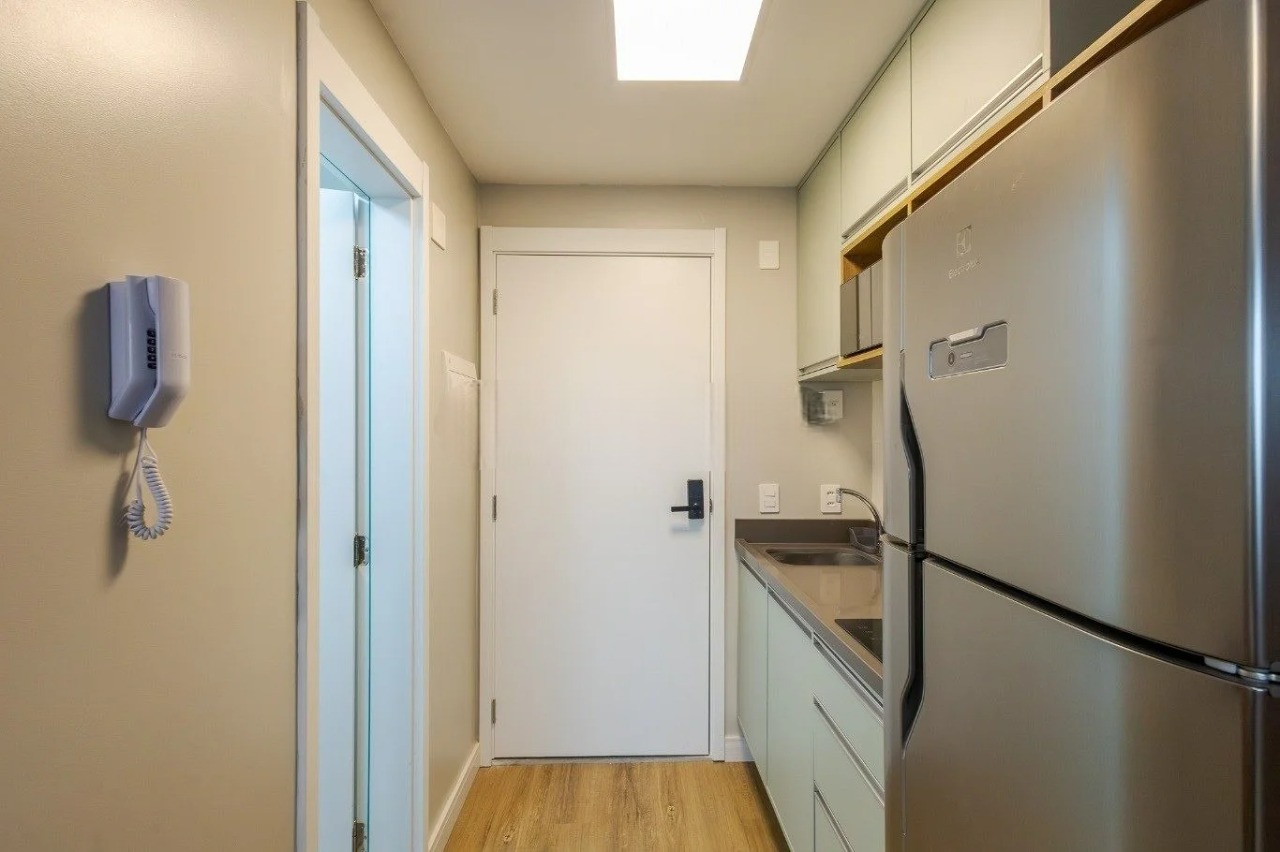 Apartamento mobiliado com 1 dormitório e 1 banheiro, equipado e pronto para morar, com ar-condicionado, armários embutidos, cozinha planejada e ambientes integrados. Conta com vista panorâmica e layout funcional.