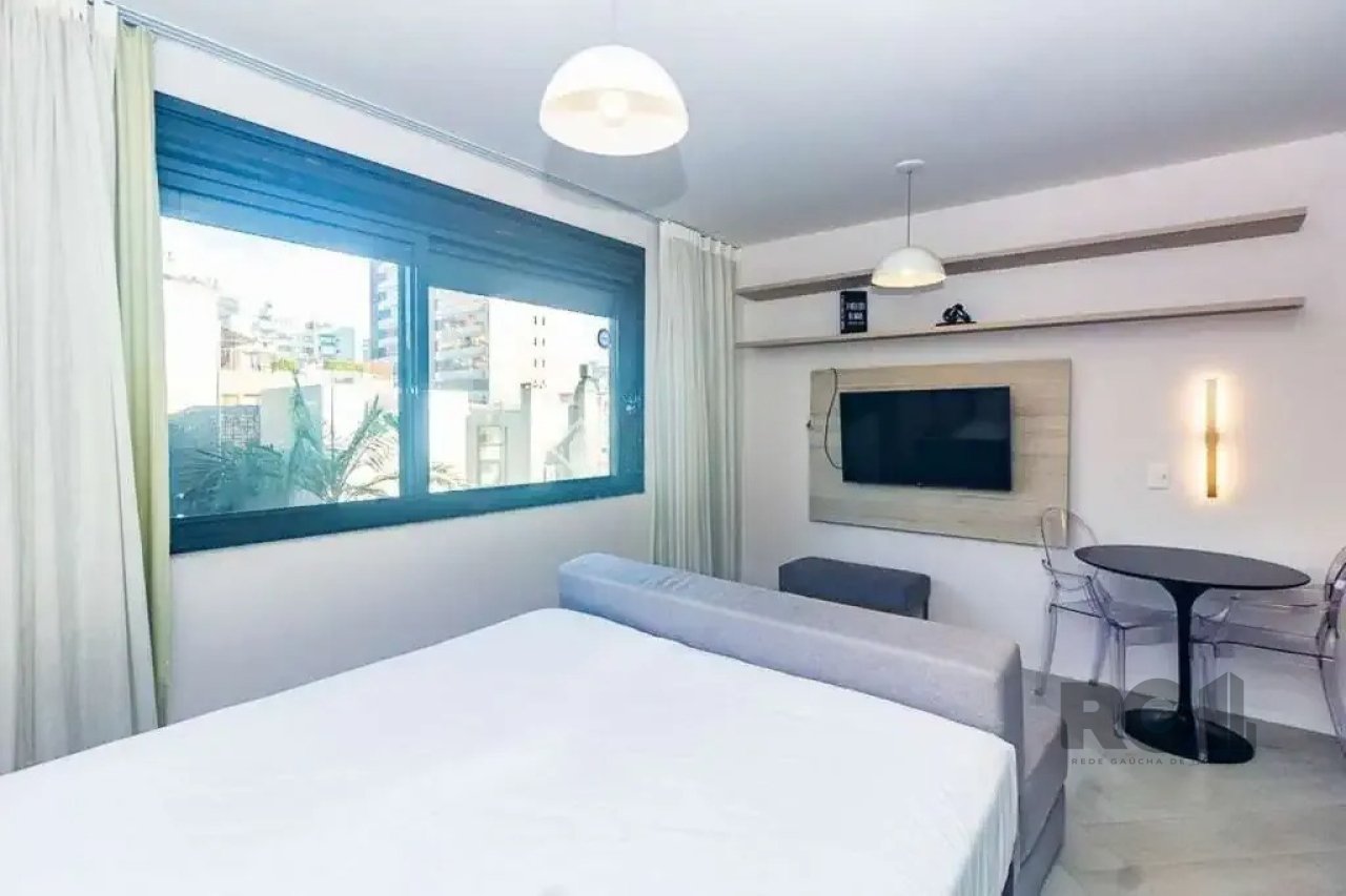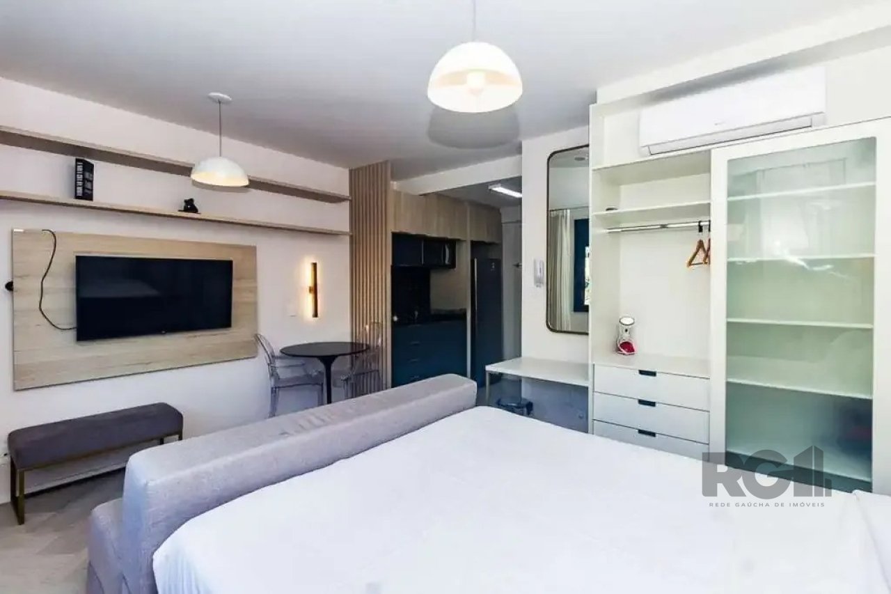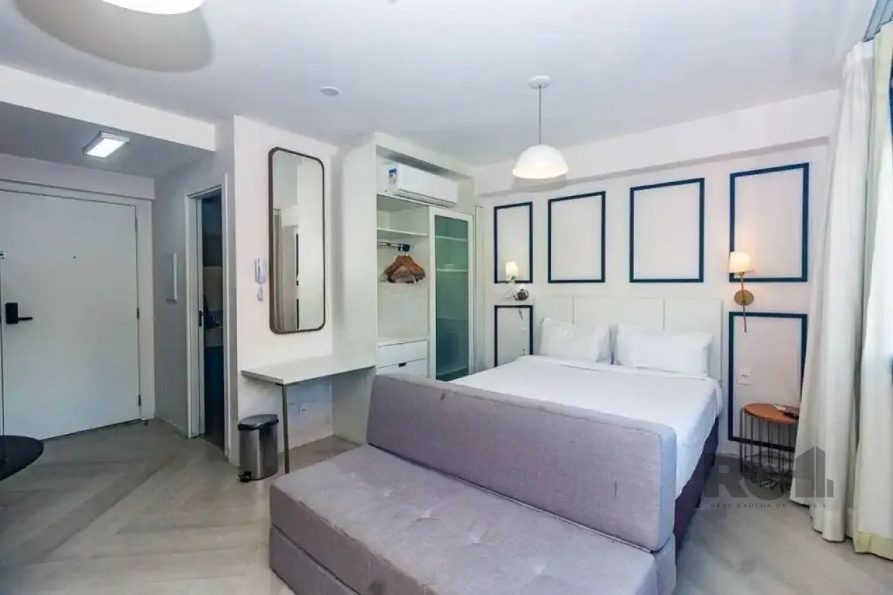 O apartamento mobiliado possui 27 m² de área privativa, organizado para aproveitar bem o espaço. O ambiente integra área de dormir e estar, equipado com cama de casal, sofá, televisor, ar-condicionado split e armário planejado. A cozinha conta com móveis sob medida, geladeira, micro-ondas e itens básicos, enquanto o banheiro social dispõe de box em vidro, espelho amplo e armário. A posição solar sul garante iluminação suave ao longo do dia.