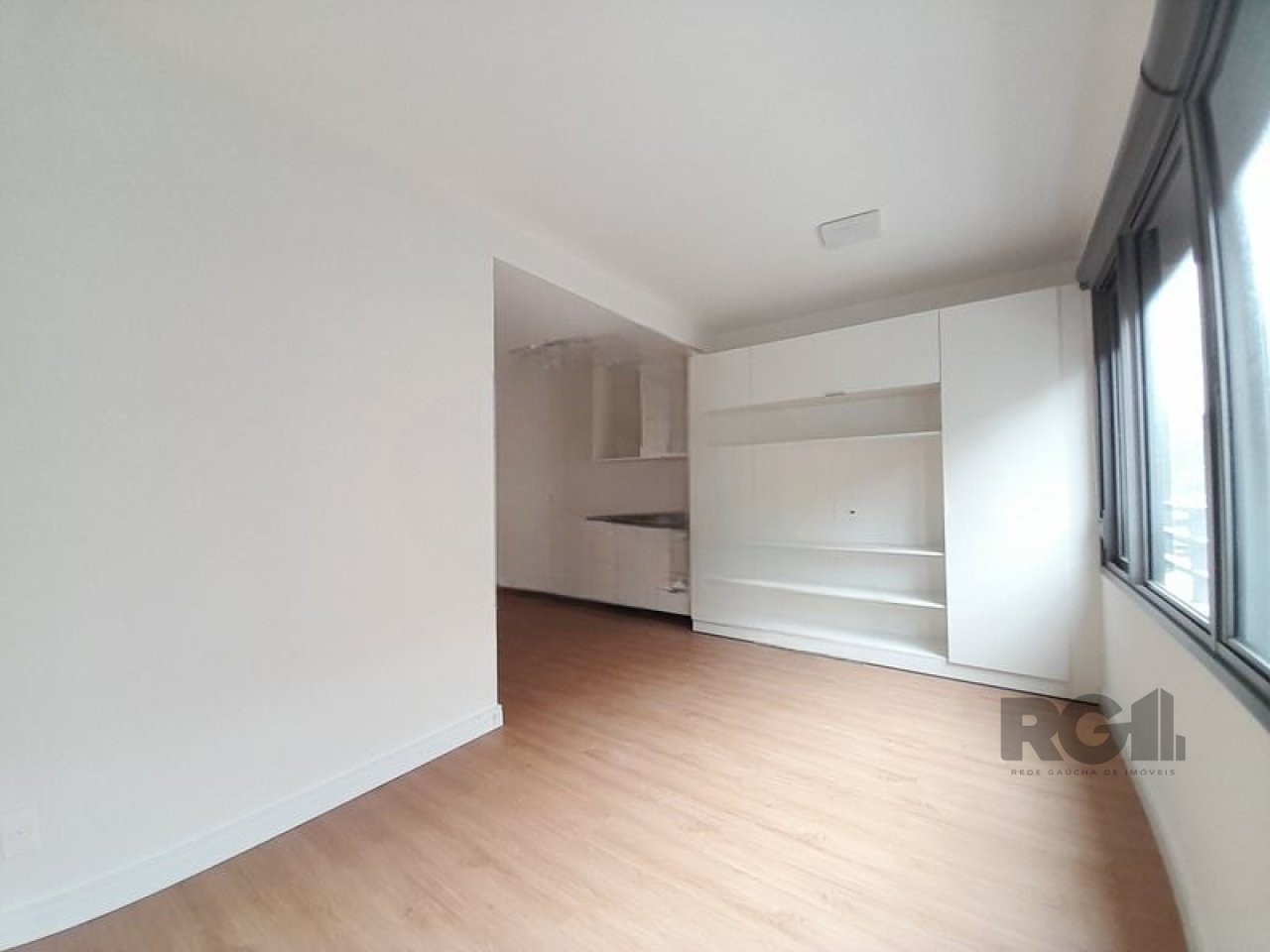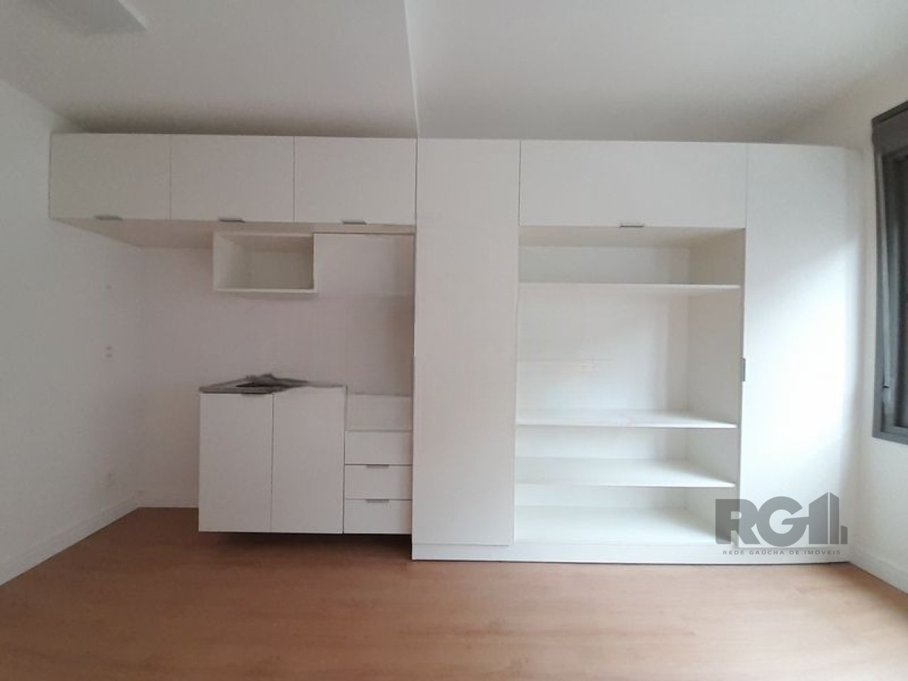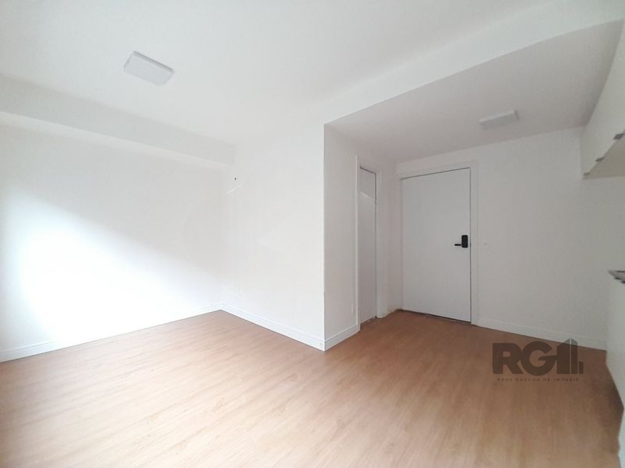 Apartamento composto por um ambiente principal e um banheiro. Uma das paredes possui estrutura fixa com armário e espaço destinado à instalação de cozinha. A unidade inclui fechadura eletrônica para controle de acesso.