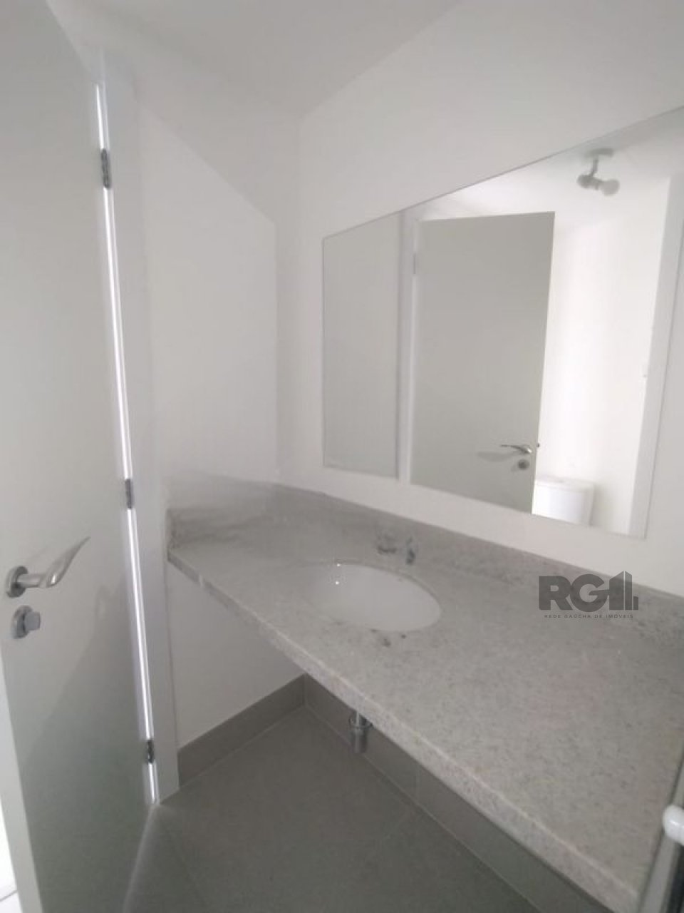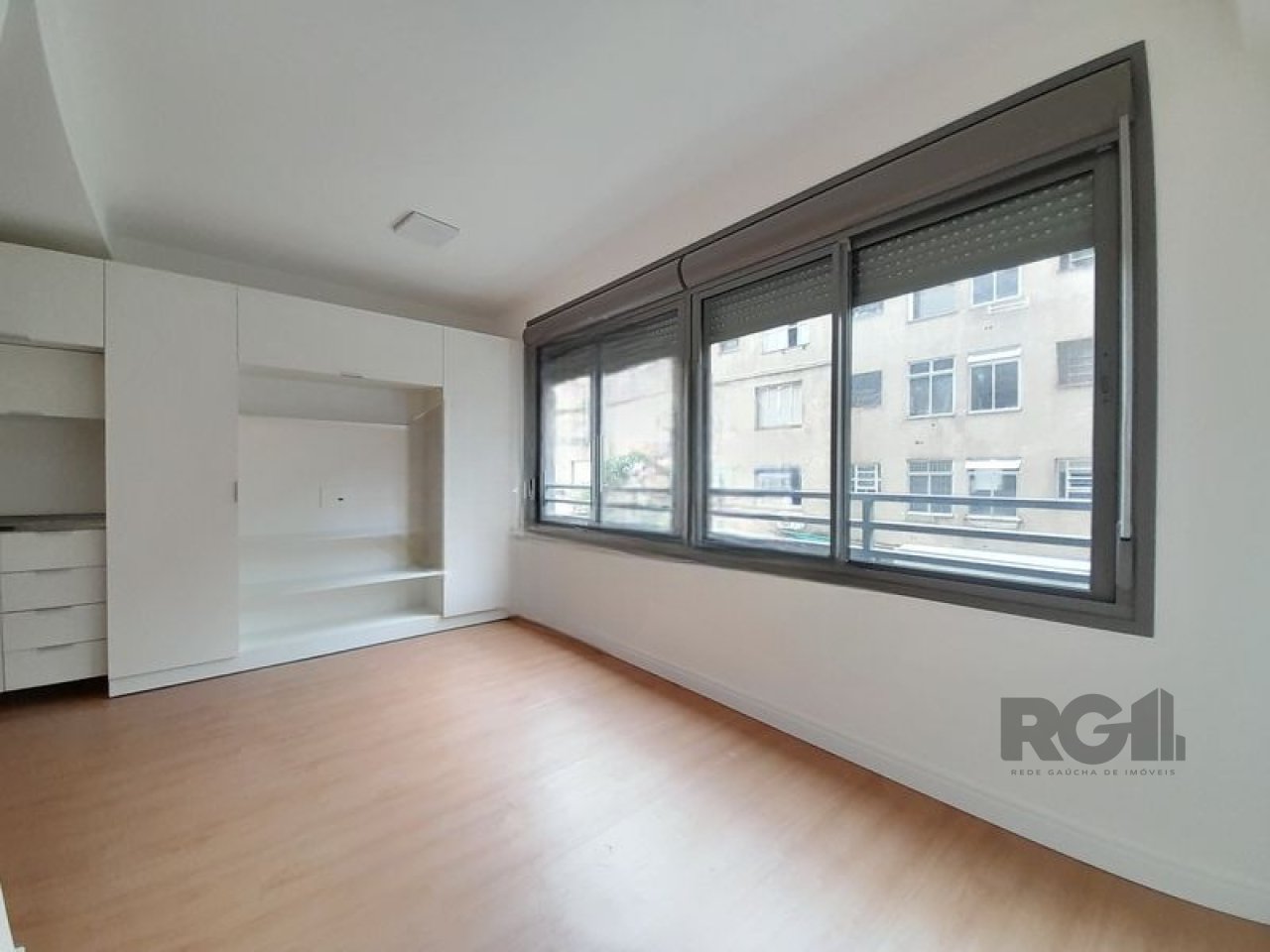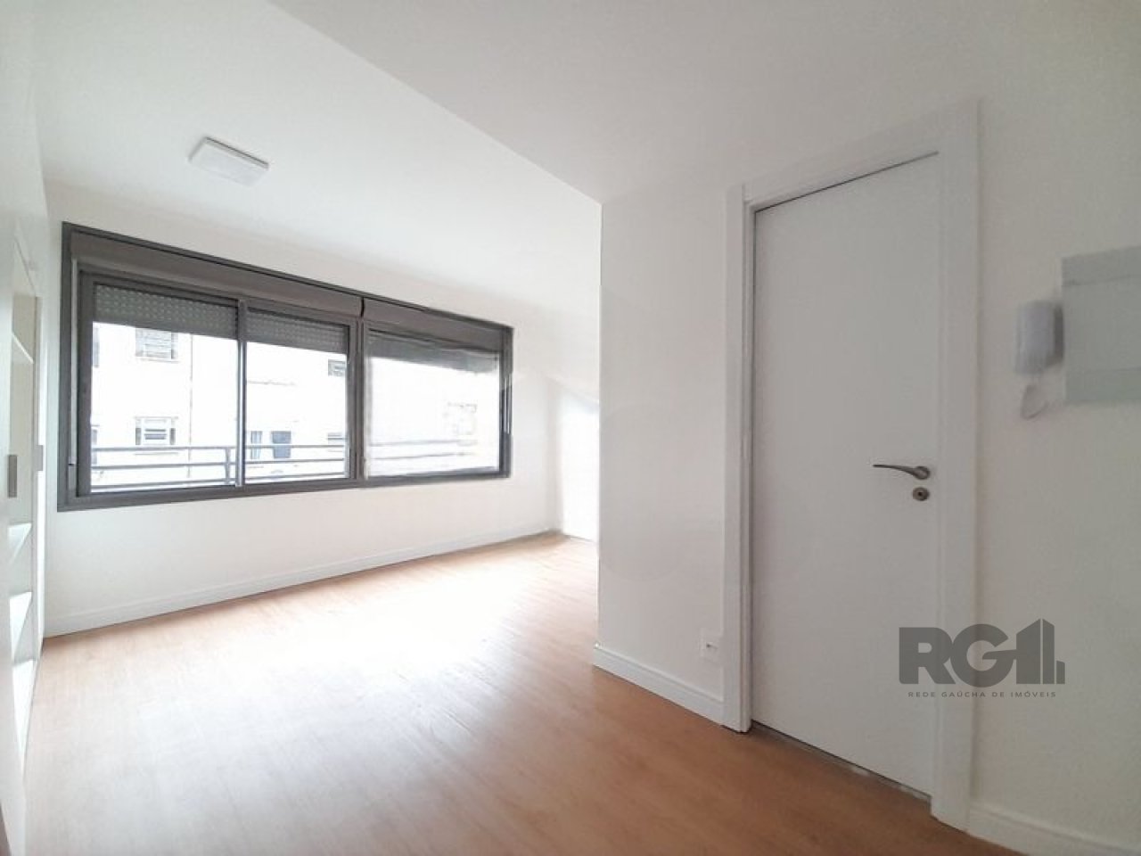 Apartamento composto por um ambiente principal e um banheiro. Uma das paredes possui estrutura fixa com armário e espaço destinado à instalação de cozinha. A unidade inclui fechadura eletrônica para controle de acesso.