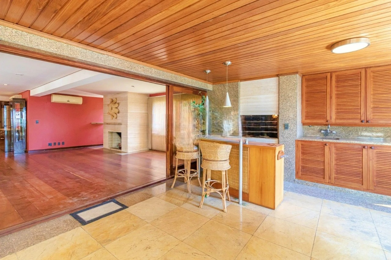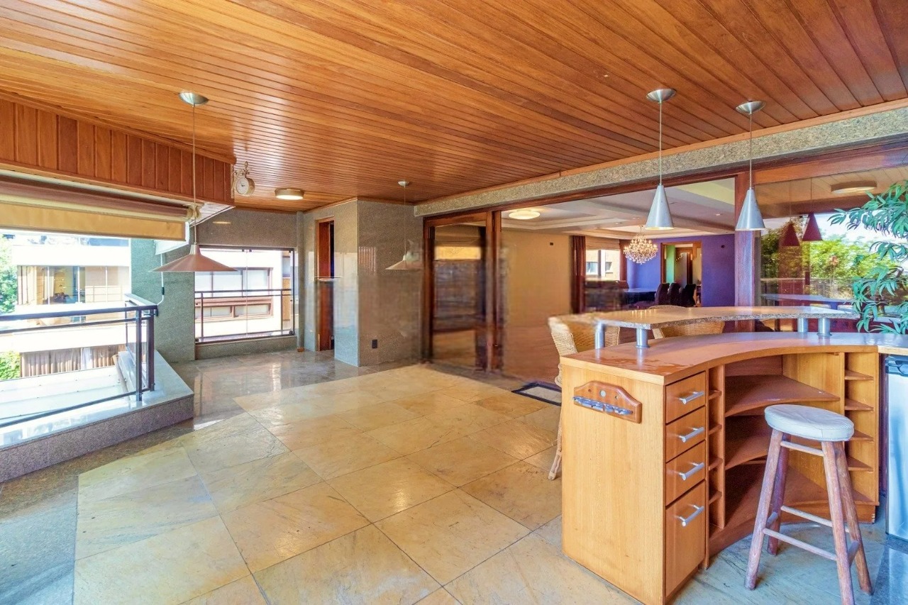 Apartamento com 385 m² privativos, quatro dormitórios, sendo três suítes, incluindo suíte máster com closet e banheira. Living amplo, com mais de 100 m², integrado à área externa privativa com piscina e churrasqueira. Conta ainda com escritório, cozinha espaçosa, área de serviço independente, boa iluminação natural, ventilação cruzada e acabamento bem conservado. Aceita pets.