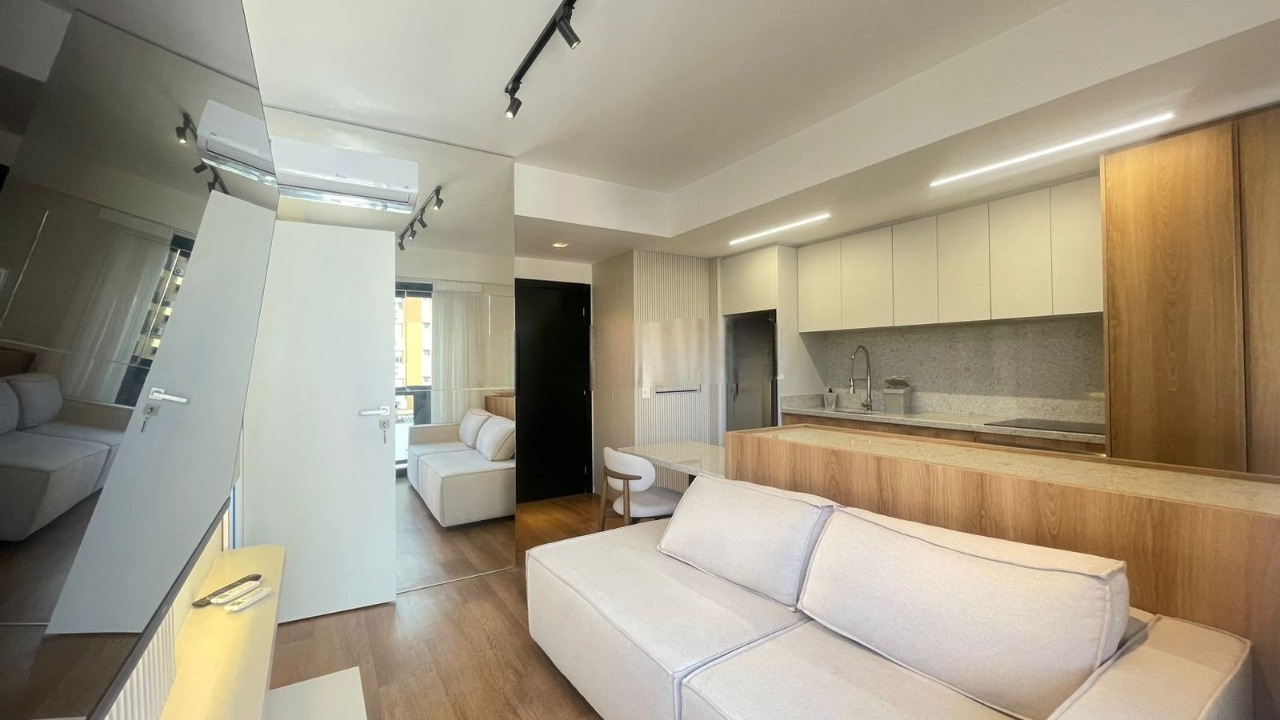 Loft mobiliado com 42m² de área privativa, distribuído em ambientes integrados e funcionais. O imóvel conta com 1 dormitório em suíte, lavabo, cozinha americana equipada com fogão de indução, micro-ondas, armários planejados e máquina lava e seca. Possui boa iluminação natural, ar-condicionado, sacada e 1 vaga de garagem coberta.