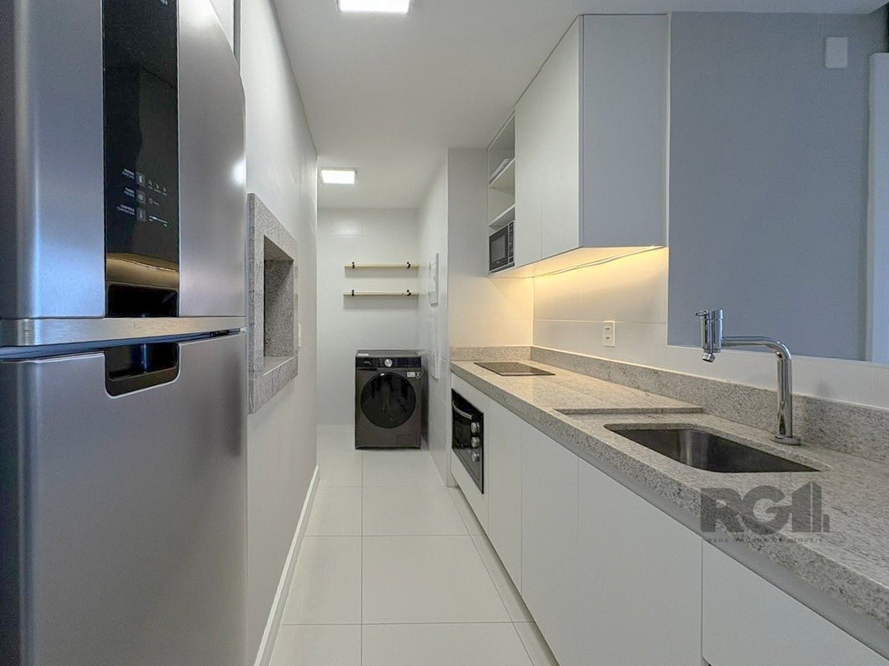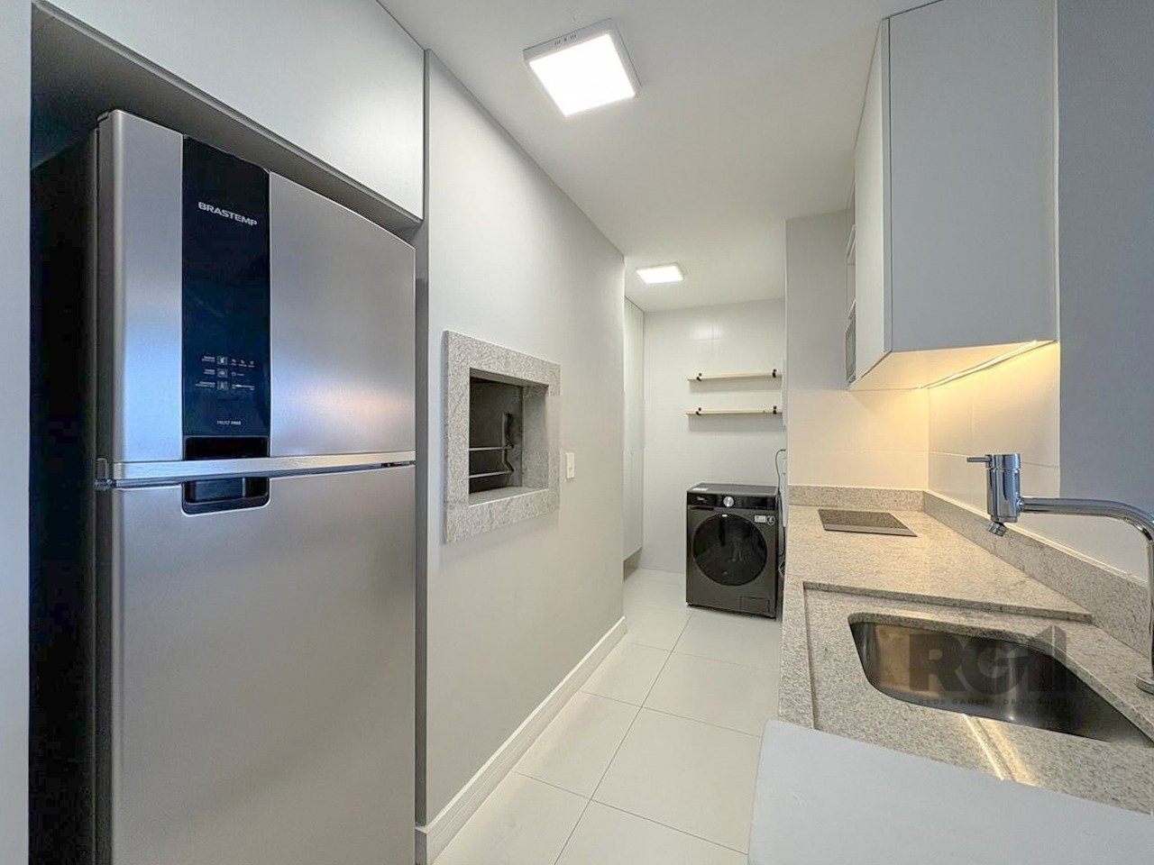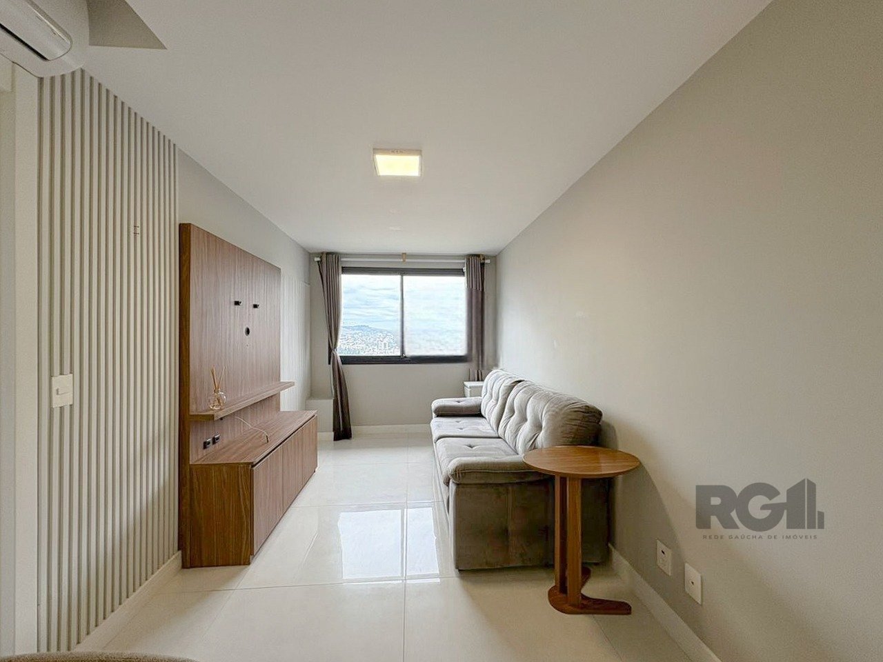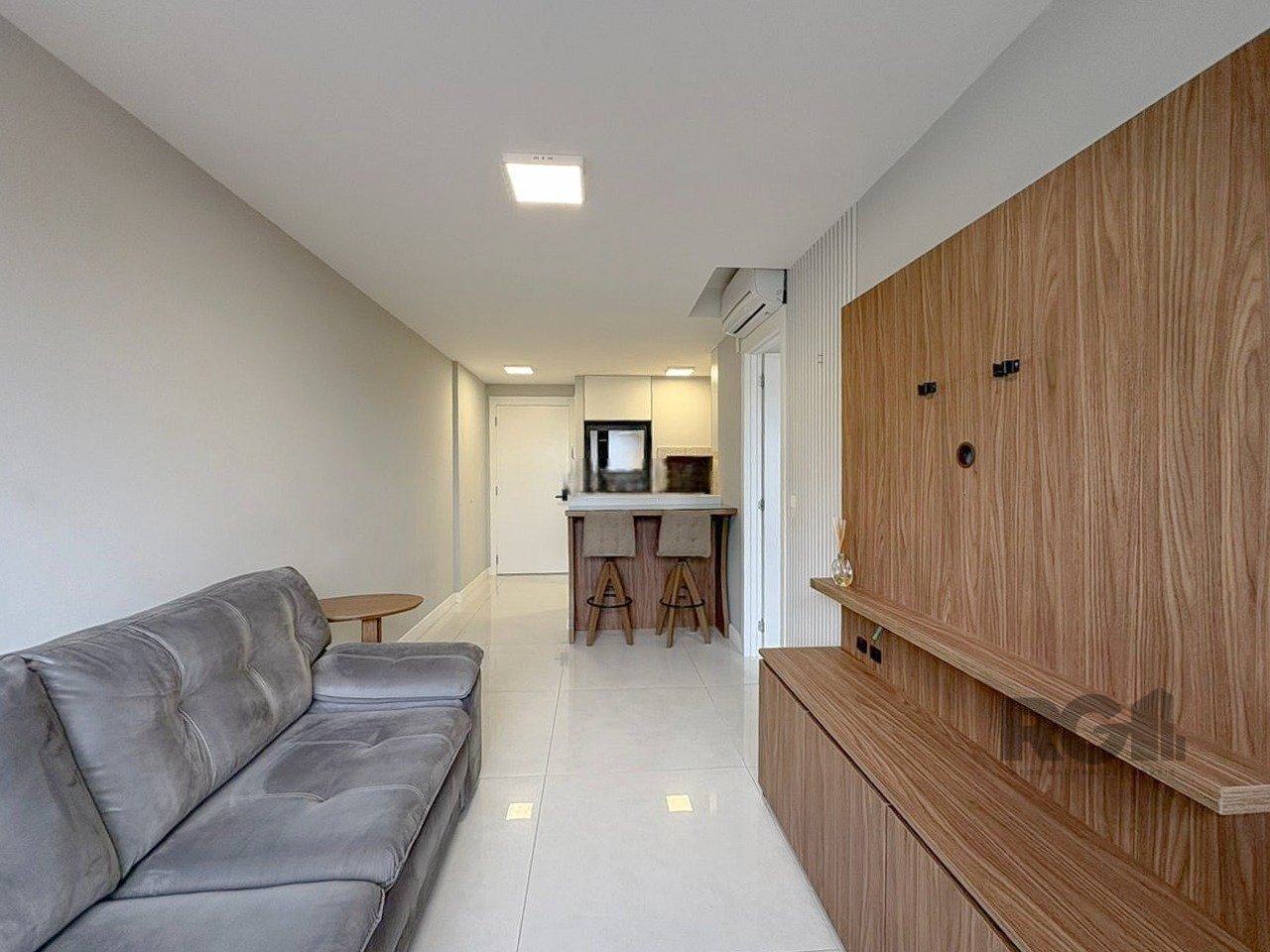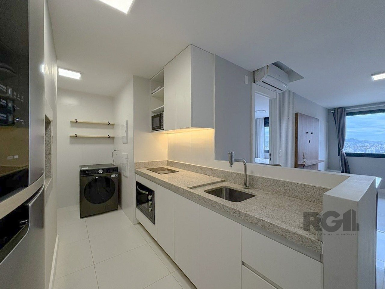 Apartamento mobiliado com um dormitório tipo suíte, living equipado com sofá, TV e ar-condicionado split. A cozinha conta com móveis planejados, geladeira, cooktop por indução, micro-ondas e churrasqueira. Há também área de serviço com máquina lava e seca, além de uma vaga de garagem.