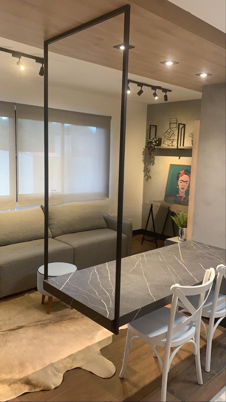Apartamento de 1 dormitório com suíte americana, totalmente mobiliado e equipado. O quarto conta com cama de casal, roupeiro estilo arara, prateleiras, gaveteiro, espelho, painel para TV, split e cortinas. Living decorado com sofá, poltronas, painel, TV, iluminação planejada e climatização. Cozinha americana com churrasqueira, armários, bancada para refeições, geladeira, cooktop, forno elétrico e micro-ondas. Área de serviço independente com máquina de lavar e aquecedor a gás. Inclui 1 vaga de garagem.