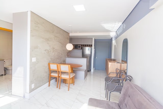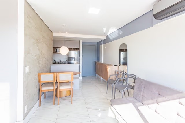 Apartamento mobiliado com 45m² privativos, composto por 1 dormitório suíte, living integrado com dois ambientes, equipado com sofá, split, mesa e painel de TV giratório, além de cozinha com armários planejados, geladeira, fogão por indução e churrasqueira. Planta funcional, com boa distribuição dos espaços.