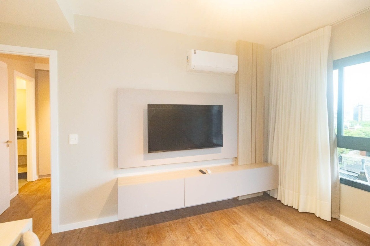 Apartamento mobiliado com 49 m² de área privativa, composto por living integrado, cozinha planejada com eletrodomésticos e churrasqueira, 1 suíte climatizada, lavabo e área de serviço. Planta funcional, com boa iluminação natural e ambientes bem distribuídos.
