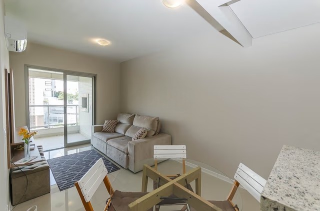 Apartamento mobiliado com 49m² privativos, composto por 1 dormitório suíte, living com acesso à sacada com churrasqueira, cozinha com armários planejados e área de serviço. Conta ainda com lavabo, água quente e 1 vaga de garagem, oferecendo praticidade no dia a dia.