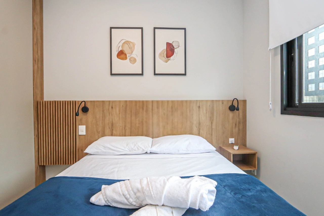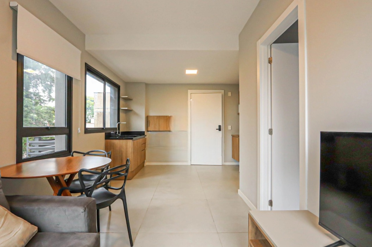 Apartamento de 1 dormitório totalmente mobiliado, com planta funcional e ambientes bem definidos. Conta com cozinha equipada, churrasqueira e banheiro, pronto para morar. Há possibilidade de locação de vaga de estacionamento em edifício ao lado, agregando praticidade à rotina.