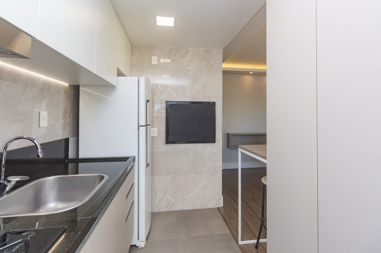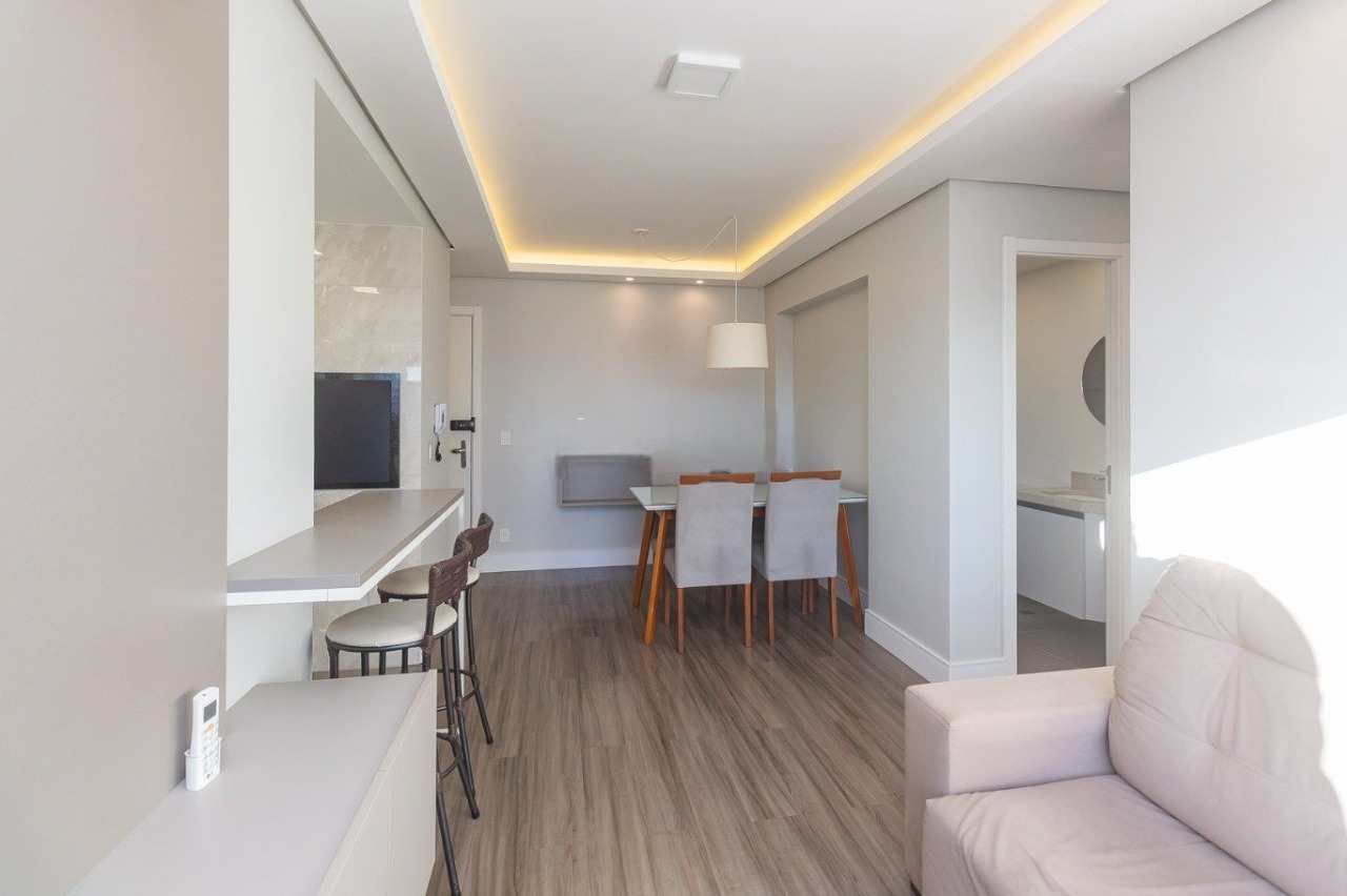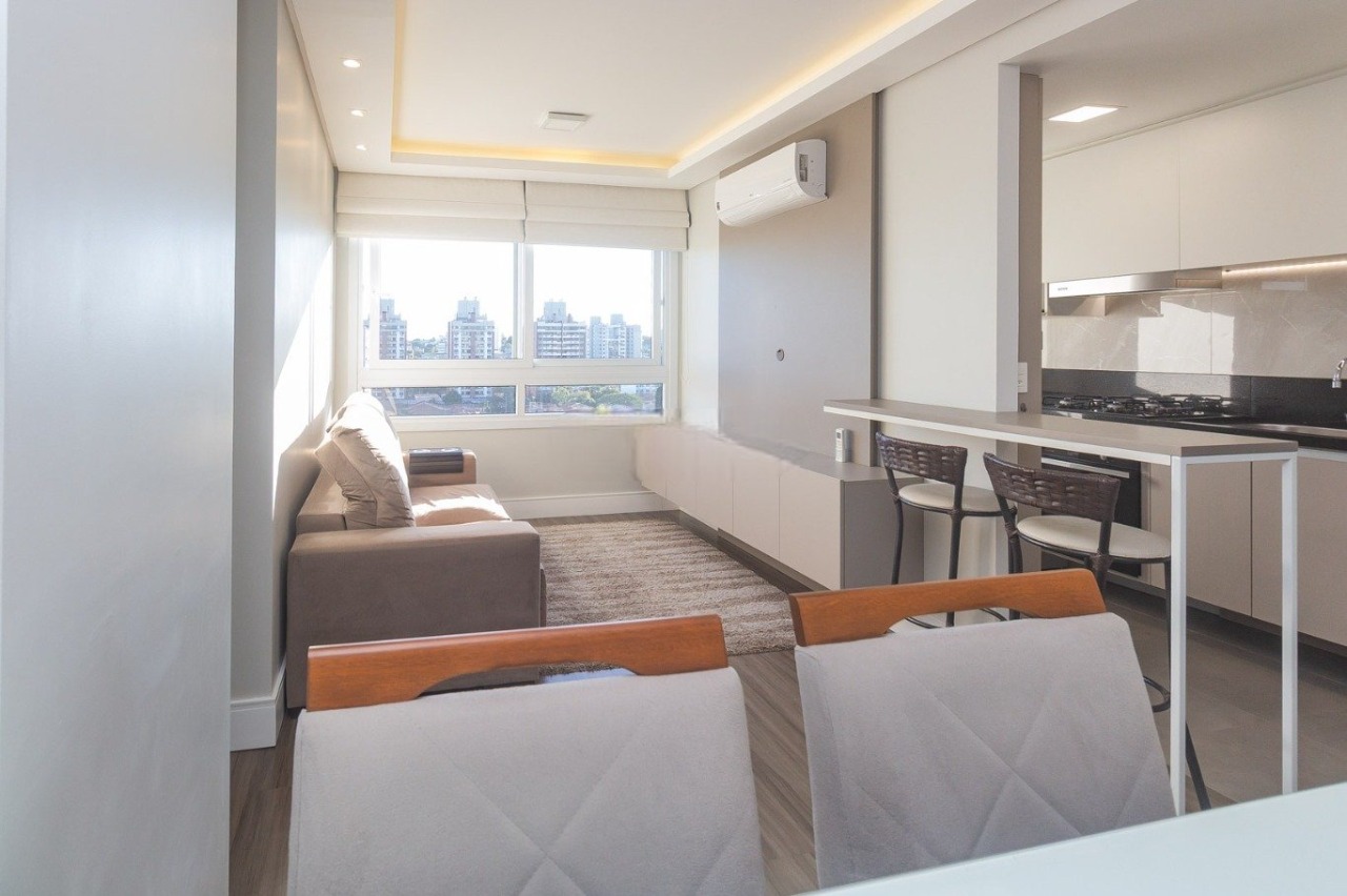 Este moderno apartamento semi-mobiliado de 56 m² foi cuidadosamente planejado para oferecer praticidade e conforto no dia a dia. O living acolhedor conta com sofá, mesa com cadeiras, painel para TV, iluminação em LED e climatização por split, criando um ambiente agradável e contemporâneo. A cozinha se destaca pela funcionalidade, equipada com armários planejados, fogão cooktop, geladeira, forno, micro-ondas e churrasqueira, perfeita para quem aprecia praticidade e momentos de convivência. A área íntima dispõe de dois dormitórios com armários e split, sendo a suíte equipada com cama de casal. O banheiro social possui box de vidro e armário, enquanto a área de serviço conta com tanque, junker e máquina de lavar. A orientação solar norte garante iluminação natural abundante ao longo do dia.