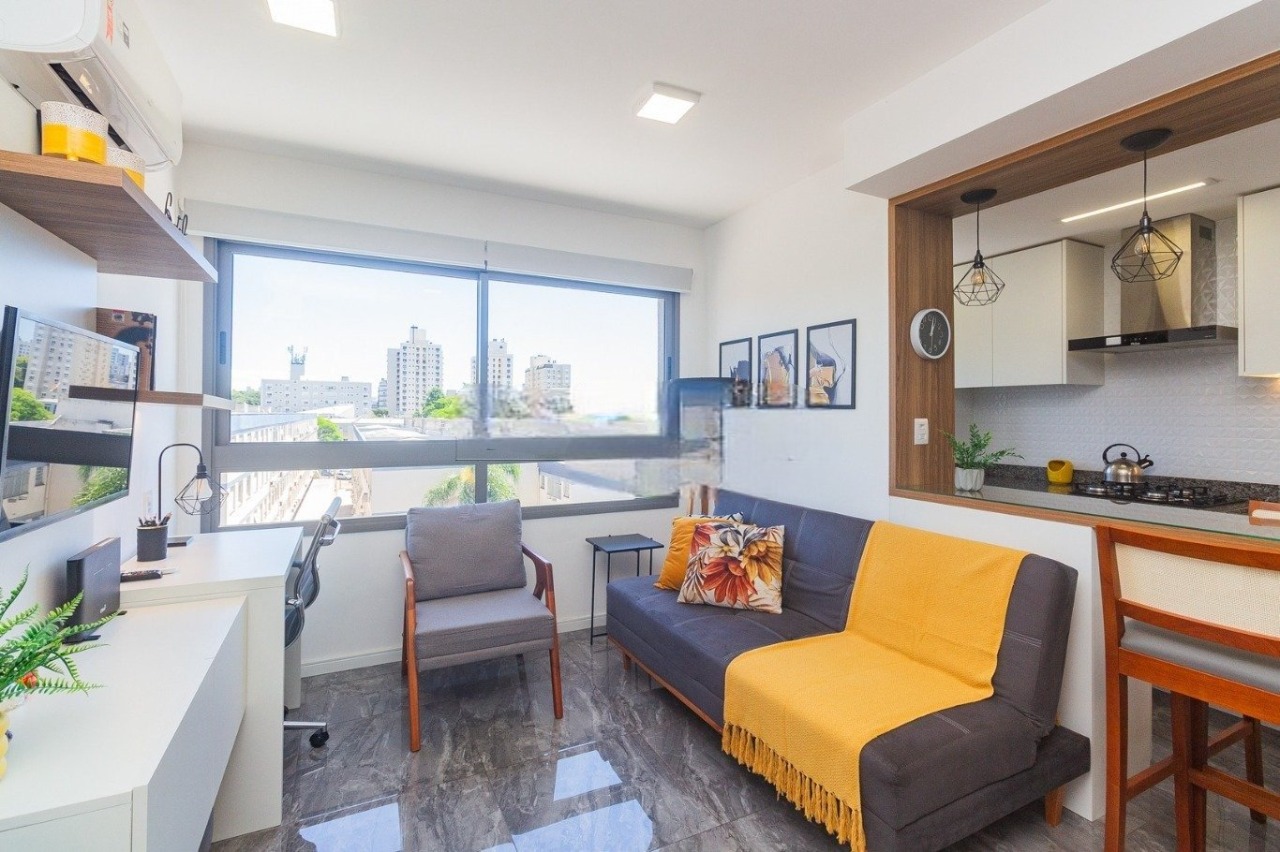 Conta com living, sala de jantar integrada, cozinha americana com bancada, banheiro com box, área de serviço e dormitório com armários planejados. Imóvel mobiliado, reformado e climatizado, com ar-condicionado split, além de 1 vaga de garagem.