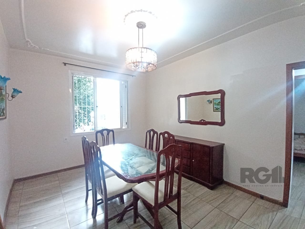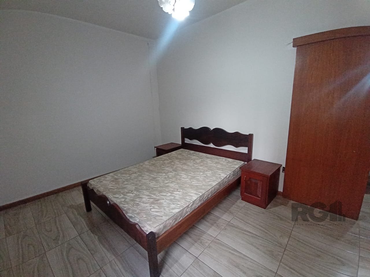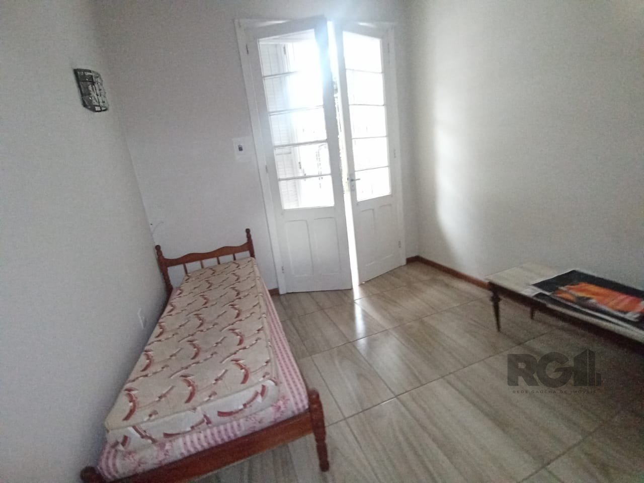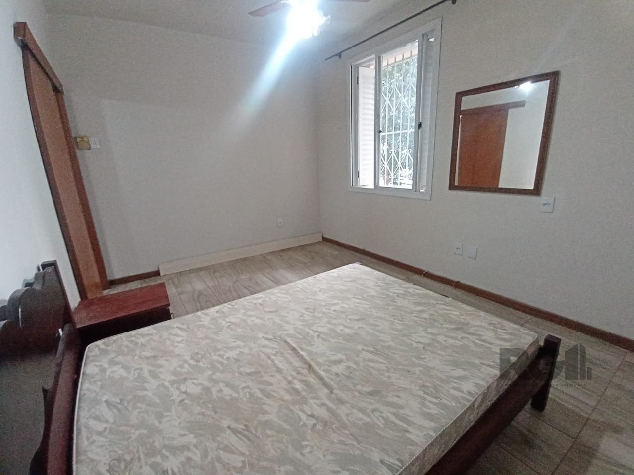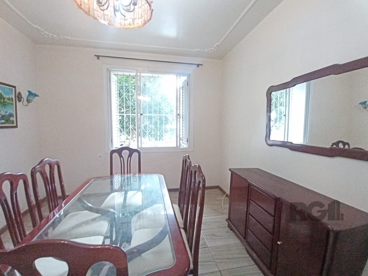 O living já está mobiliado com mesa de vidro e cadeiras. A cozinha tem armários, geladeira e fogão. São dois dormitórios, um com cama de casal e ventilador de teto, e outro com cama de solteiro e acesso ao pátio. O banheiro social tem box em acrílico e armário.