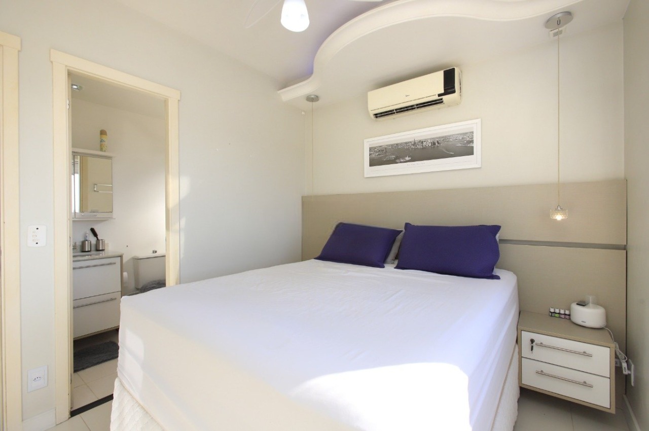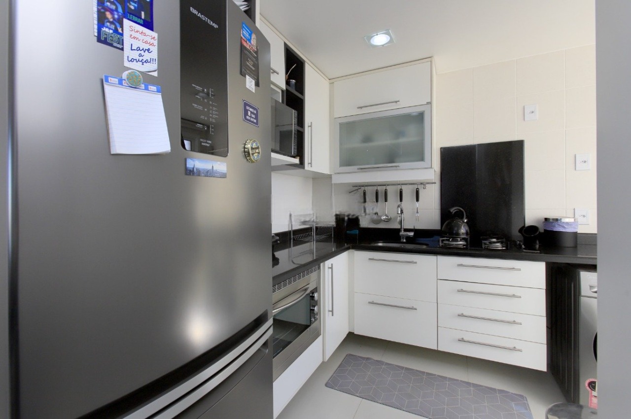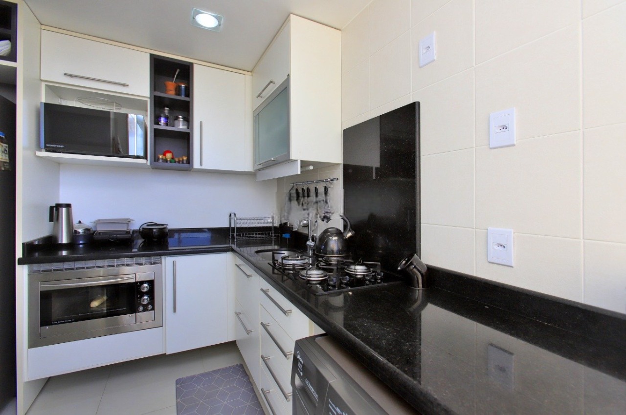 Apartamento com 65 m² privativos, composto por dois dormitórios, sendo uma suíte, além de banheiro social e duas vagas de garagem cobertas. Living amplo, cozinha americana com móveis planejados e ambientes bem ventilados. Unidade no último andar, com vista panorâmica e acabamentos em porcelanato.