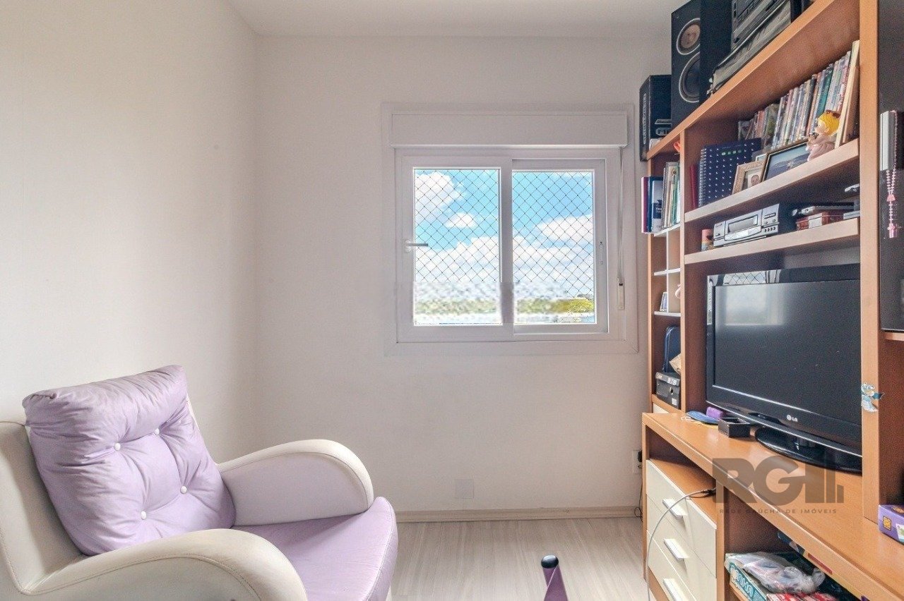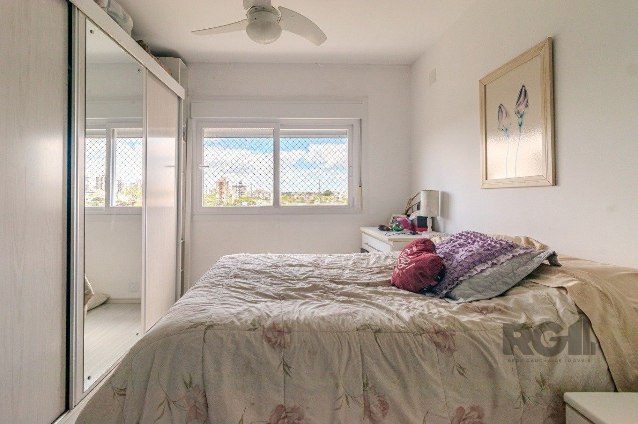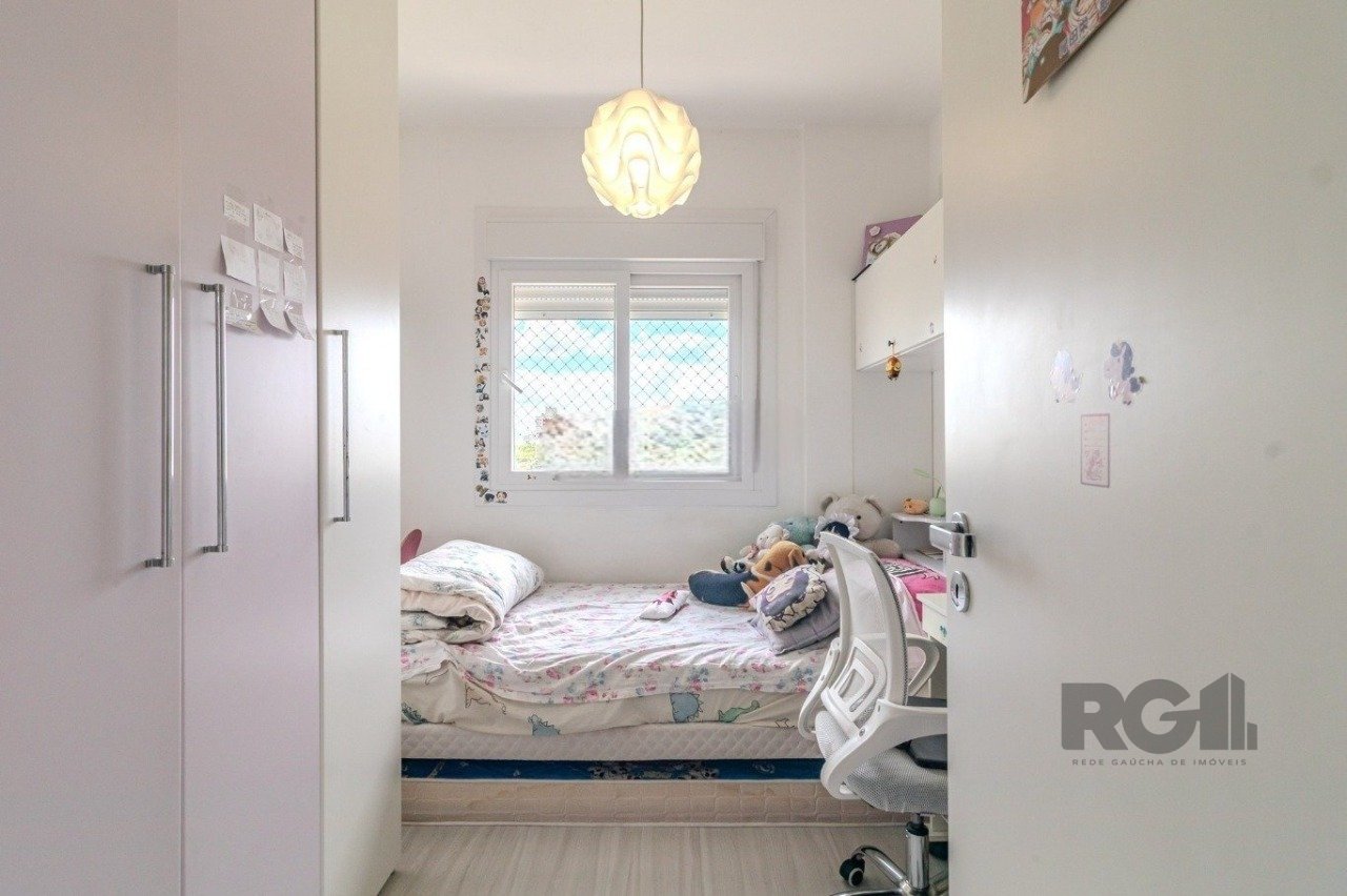 O apartamento possui 75 m² de área privativa, distribuídos em três dormitórios, sendo um deles suíte. O living integra estar e jantar, a cozinha é funcional e o imóvel conta ainda com banheiro social, área de serviço, churrasqueira, gás central, água quente e uma vaga de garagem escriturada.