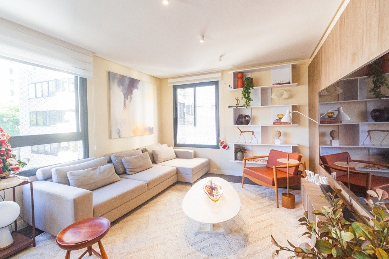 Apartamento mobiliado com 81 m² de área privativa, distribuído em um living integrado com estar e jantar, climatizado e mobiliado, cozinha planejada equipada com eletrodomésticos, lavabo e duas suítes com ar-condicionado, sendo uma com cama de casal e outra de solteiro. Planta funcional, bem aproveitada e com iluminação natural no período da tarde.