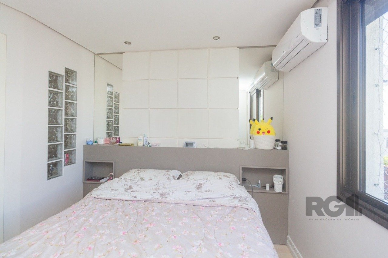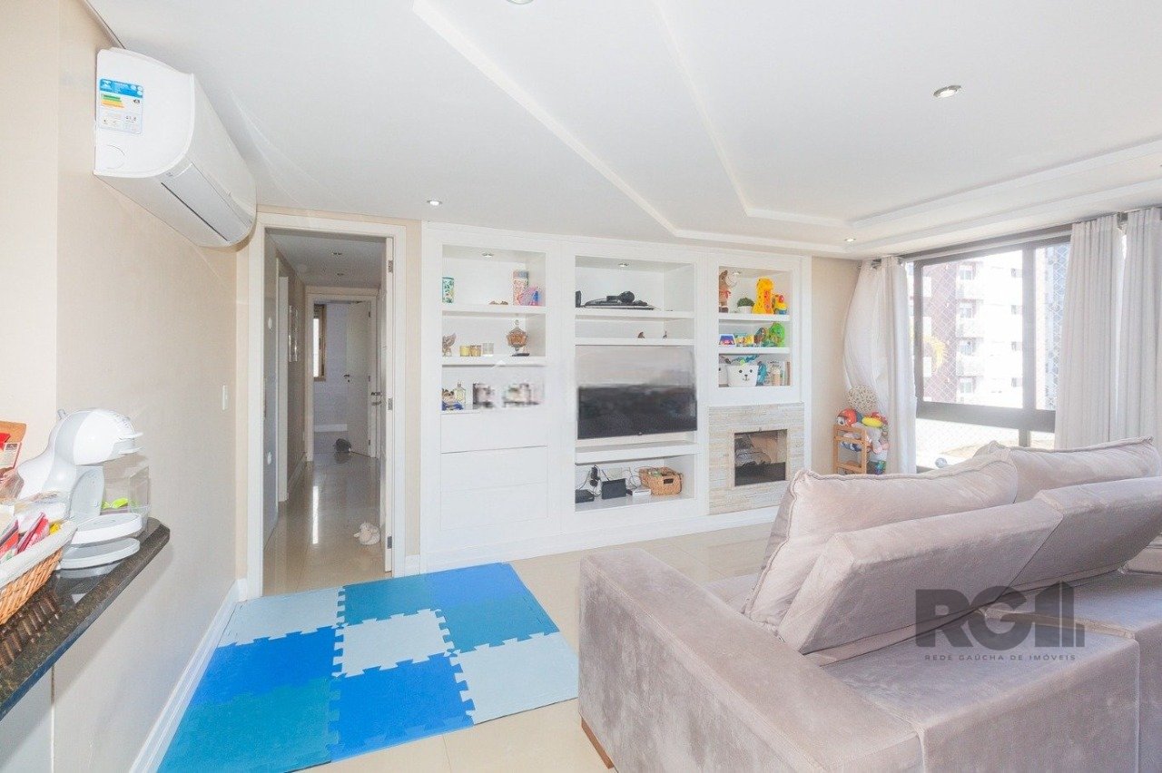Apartamento de 90 m² com três dormitórios, incluindo uma suíte, três banheiros e área de serviço equipada com tanque e máquina de lavar. O living para dois ambientes possui sofá, painel para TV, split, mesa com cadeiras e lareira, além de churrasqueira integrada. A cozinha conta com pia, armários, fogão e geladeira. A suíte inclui cama, painel para TV, armário sob medida, split e banheiro com banheira. Os demais dormitórios têm armário, split e espaço para home office ou estudos. O imóvel inclui uma vaga de garagem.