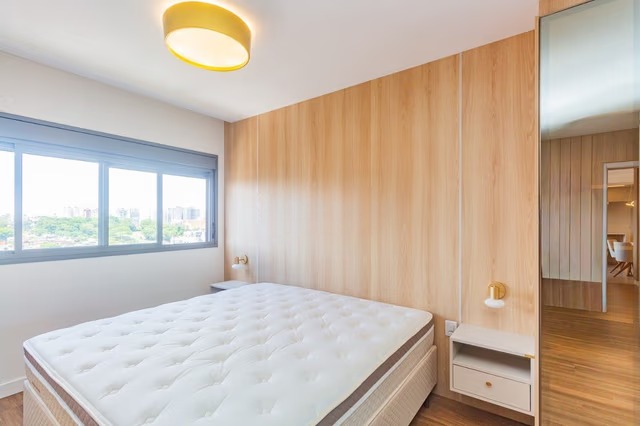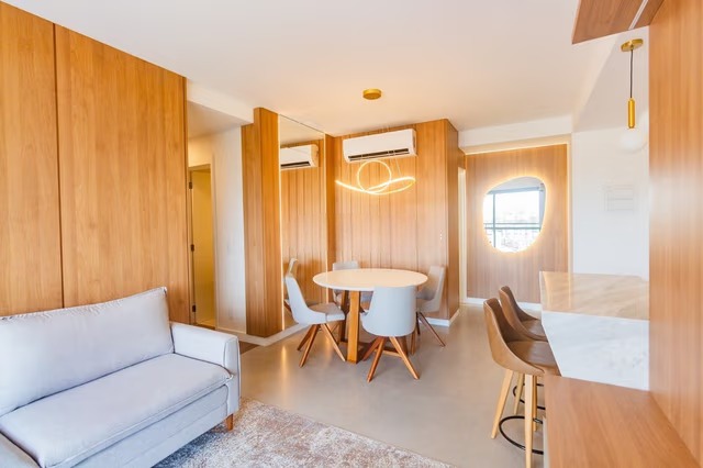 Apartamento mobiliado com 93m² privativos, composto por 3 dormitórios, sendo 1 suíte, living para dois ambientes integrado à sacada com churrasqueira, cozinha americana equipada com móveis planejados, cooktop e forno, além de banheiro social, lavabo e área de serviço. Ambientes climatizados e com mobiliário completo.