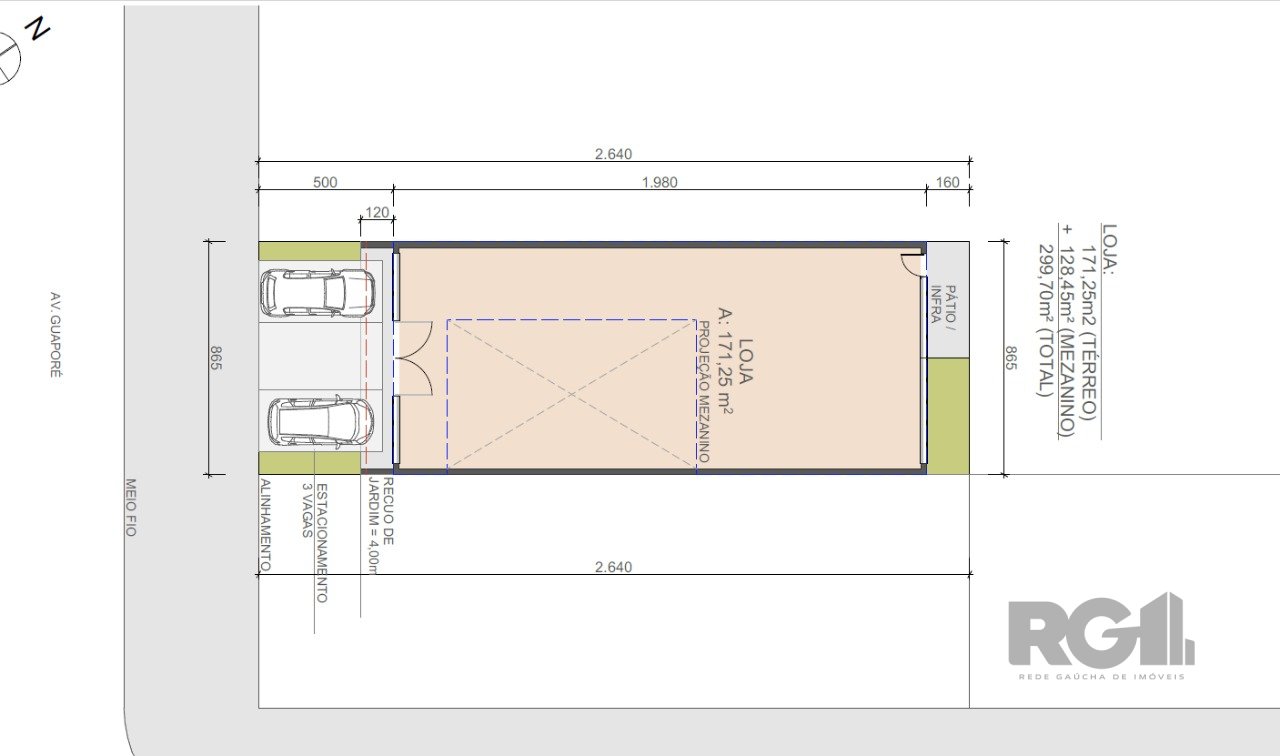 Loja comercial a ser construída, com área total de 170 m², distribuída entre térreo e mezanino. O projeto inclui dois banheiros, caixa de gordura, cortina metálica automática na fachada e pátio nos fundos.