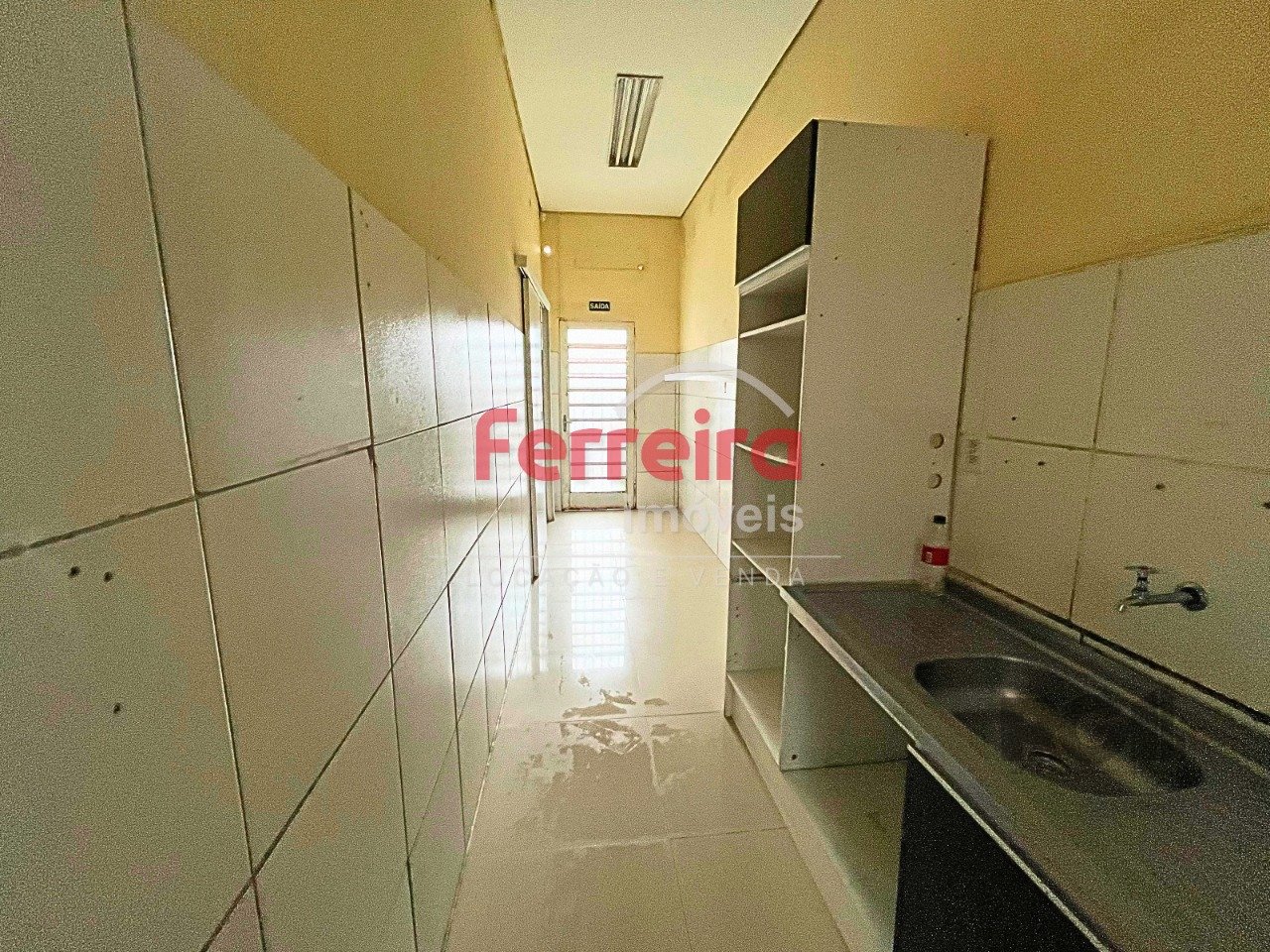 O imóvel conta com uma vaga de garagem frontal, ideal para carga e descarga ou uso de clientes. A estrutura interna inclui três banheiros, cozinha e pátio nos fundos, proporcionando apoio funcional para diferentes tipos de atividades comerciais.