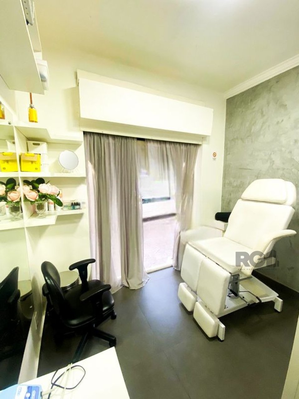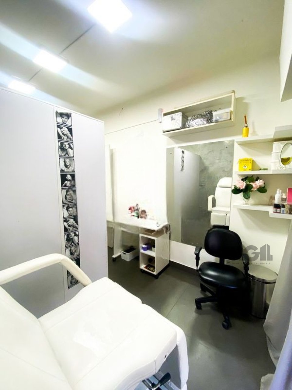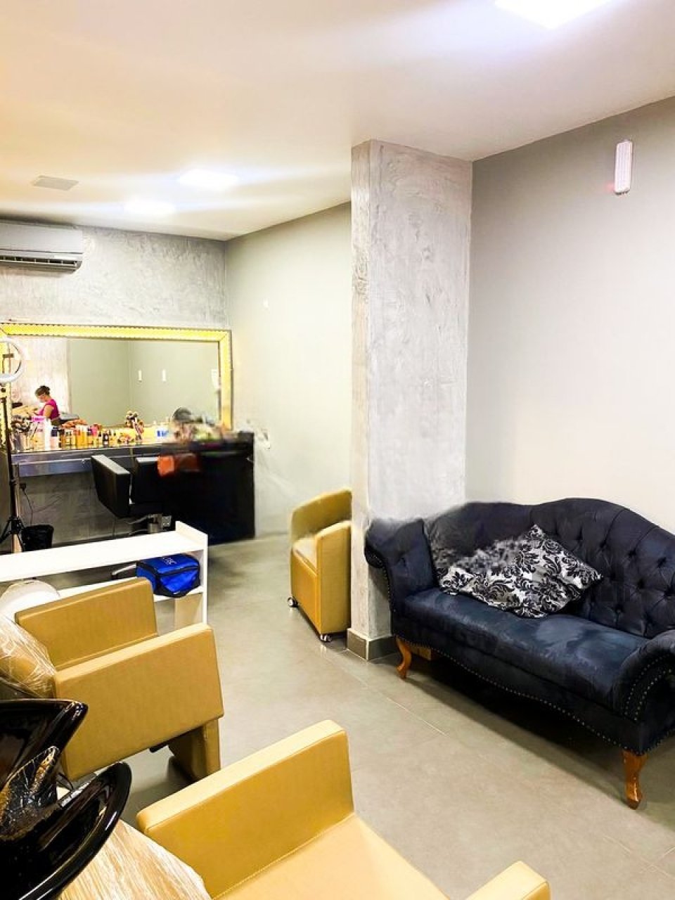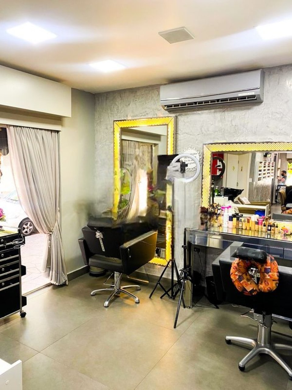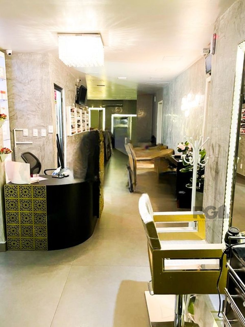 O espaço possui um salão principal e está equipado com mobiliário voltado para atividades de estética, incluindo cadeiras, espelhos, macas e sistema de climatização.