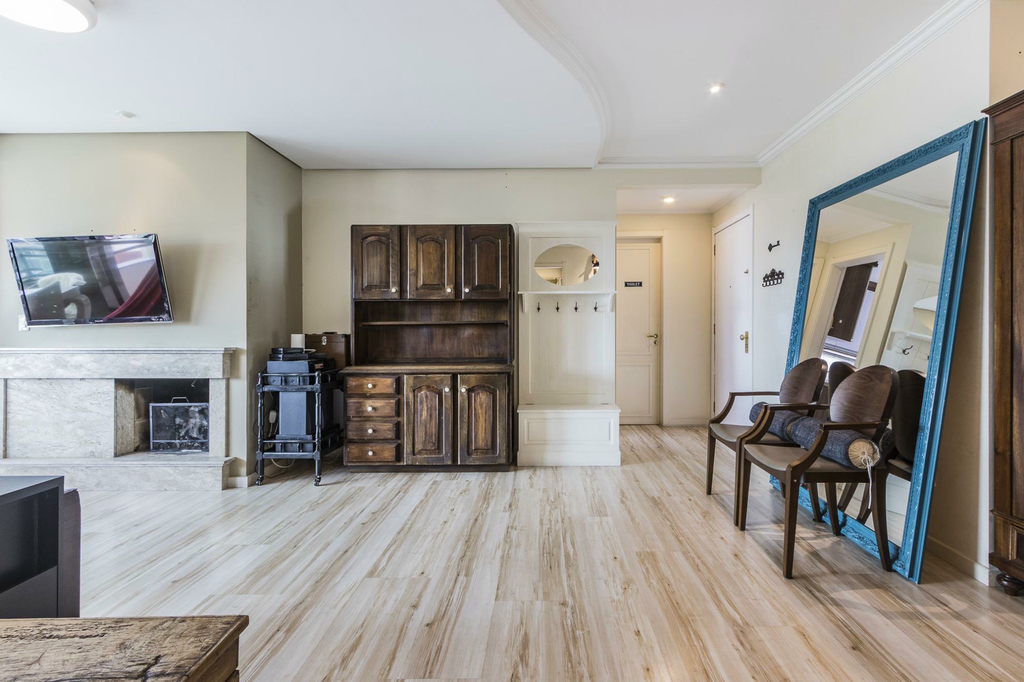 O living é amplo, com lareira e lavabo, perfeito para reunir a família em todas as estações. O apartamento é semi-mobiliado e permanecem os móveis planejados e os eletros fixos, incluindo ar-condicionado, ventilador, forno, cooktop e coifa, oferecendo praticidade desde o primeiro dia.