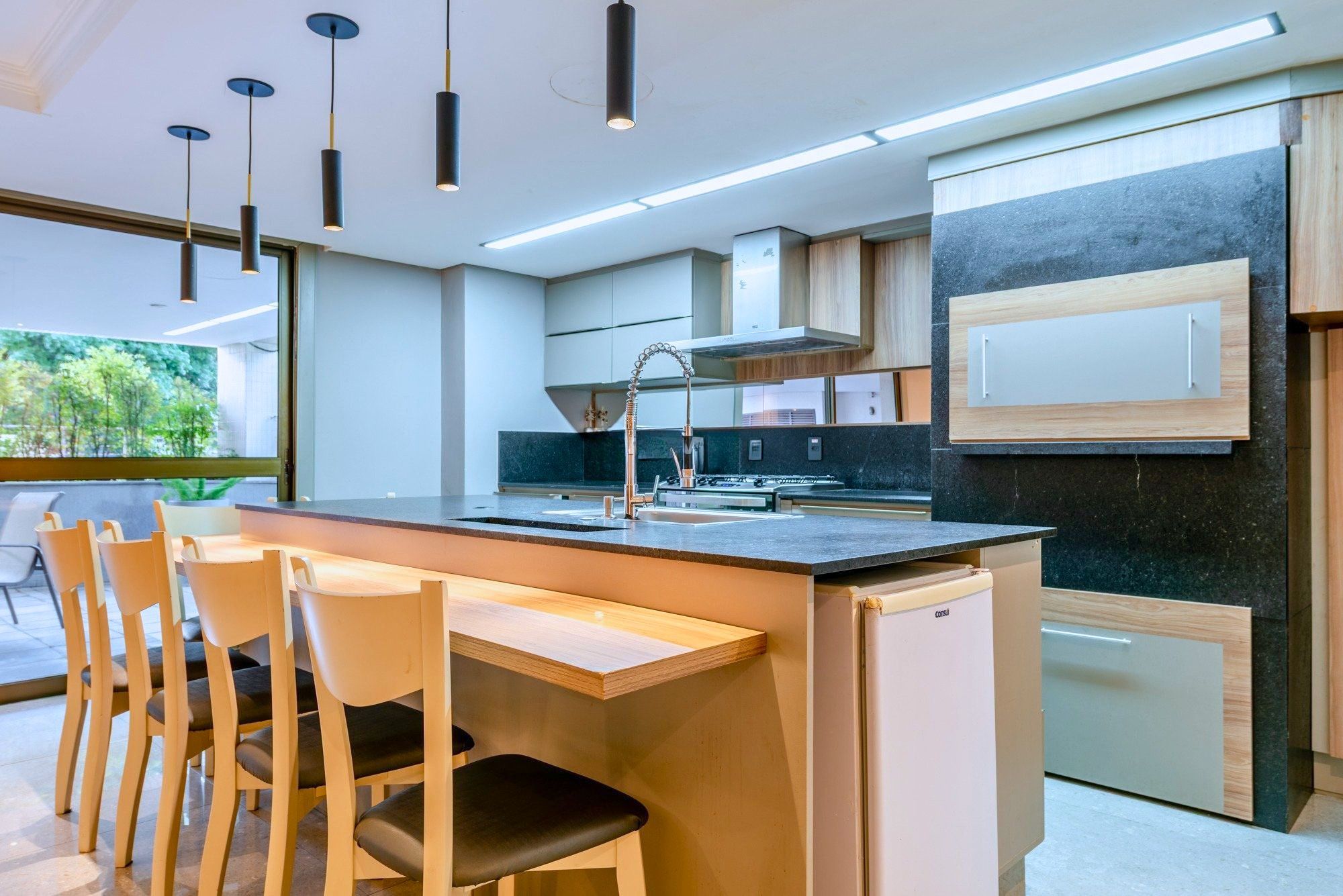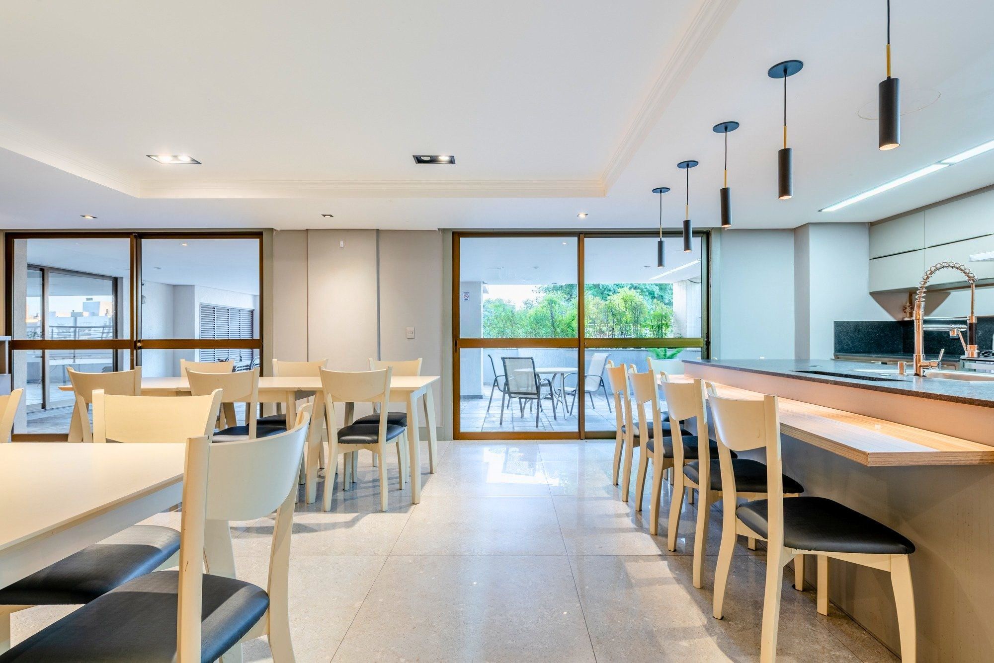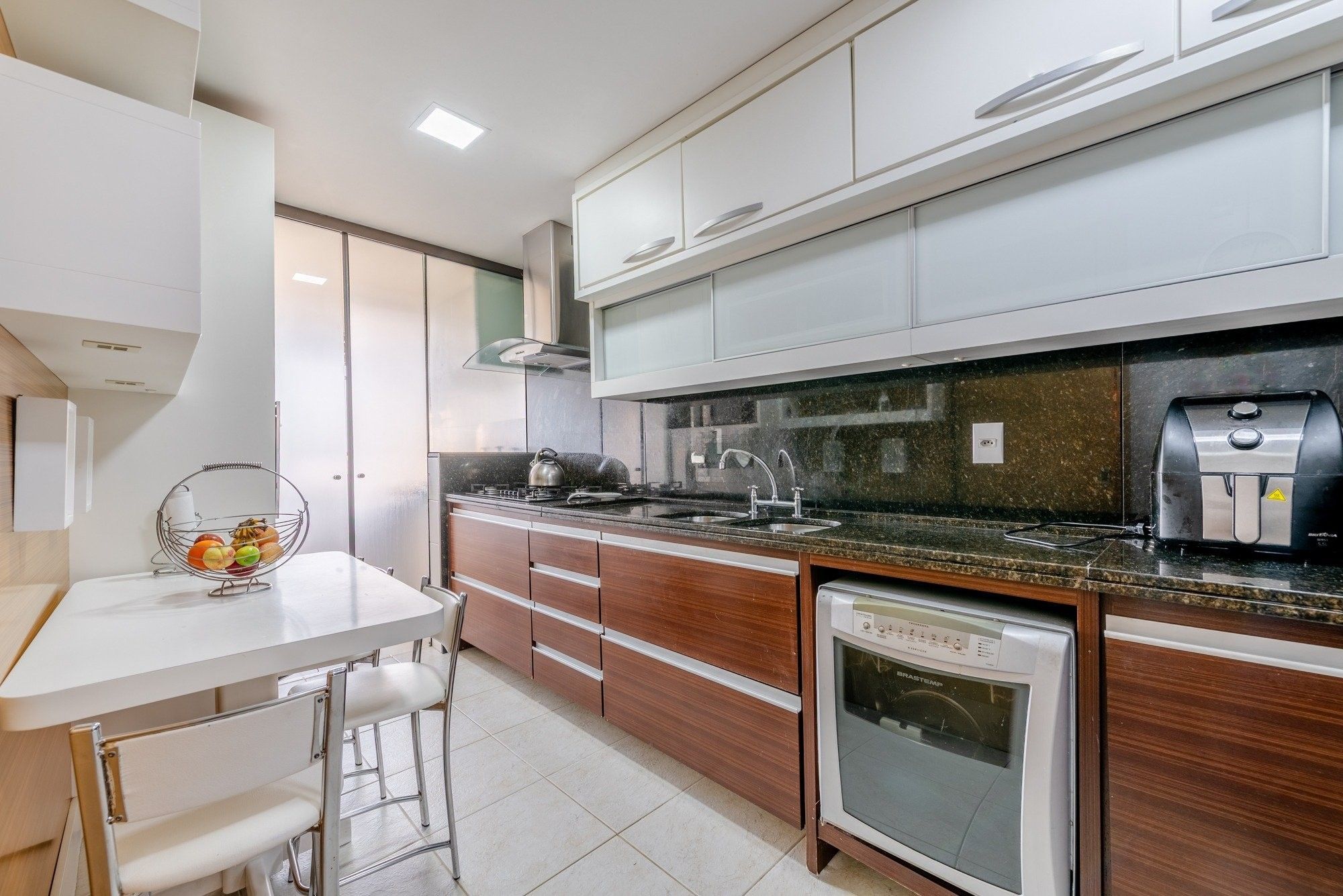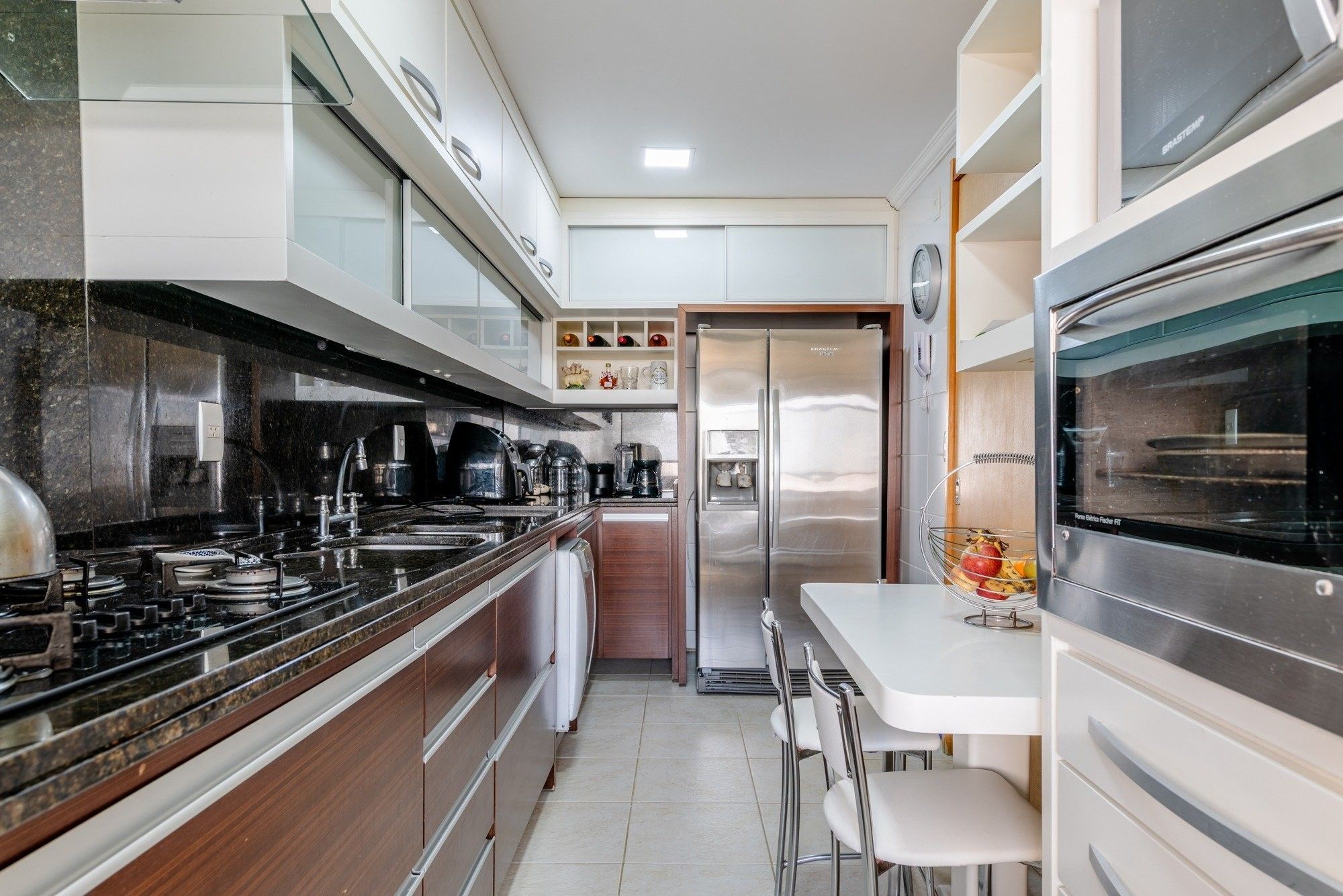 A cozinha é totalmente mobiliada, prática e bem distribuída, com área de serviço separada para maior organização no dia a dia.