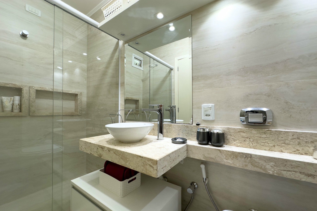 Apartamento reformado de 1 dormitório, living 2 ambientes, ficam os móveis fixos, banheiro social com 2 portas, cozinha americana, sol da manhã, posição solar Leste.