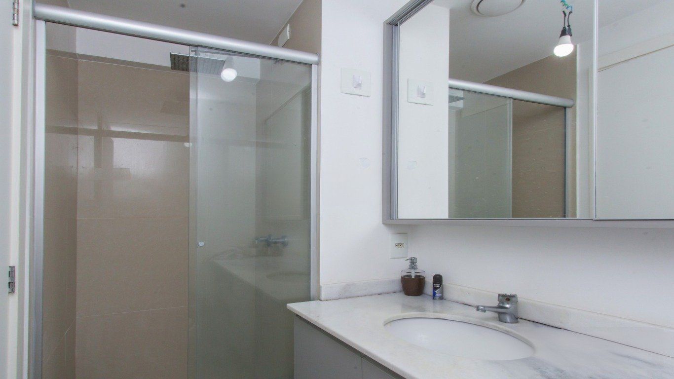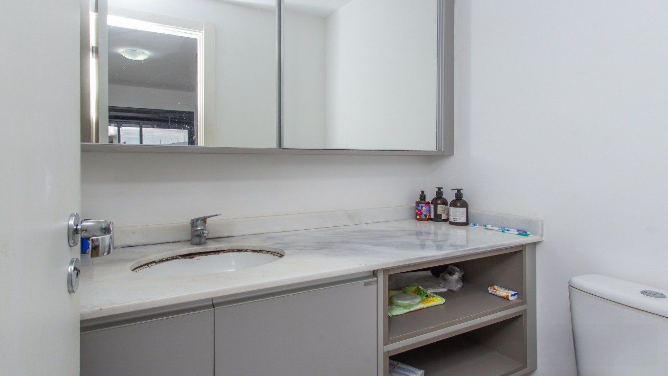 Apartamento de frente, em andar intermediário, com ampla vista livre e excelente incidência de iluminação natural. O imóvel possui planta bem distribuída, composta por living para dois ambientes, lavabo e cozinha em conceito aberto (americana), equipada com armários sob medida. Área de serviço integrada, com aquecedor de passagem (junker) instalado.