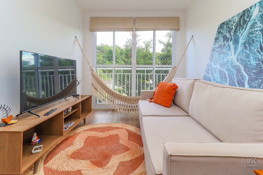 O apartamento está semi mobiliado, tem privacidade nas janelas e vista para o verde. São 2 dormitórios, sendo um deles suíte, 58m2, churrasqueira na cozinha, água quente. Vaga de garagem escriturada.