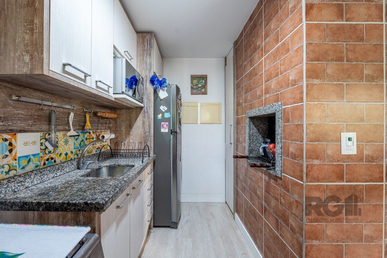 Apartamento com dois dormitórios, sendo um deles suíte. Possui cozinha com churrasqueira integrada, lavanderia separada e vaga de garagem coberta com escritura. Um espaço funcional e bem distribuído, ideal para o dia a dia.