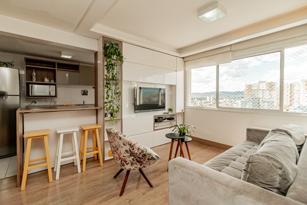 O living para dois ambientes integra-se harmoniosamente à cozinha planejada em conceito americano, criando um espaço amplo, aconchegante e perfeito para receber amigos e familiares. O imóvel conta ainda com churrasqueira privativa, ar-condicionado instalado, aquecedor de água, área de serviço e é semi-mobiliado, com armários embutidos nos dormitórios e na sala, garantindo praticidade no dia a dia.