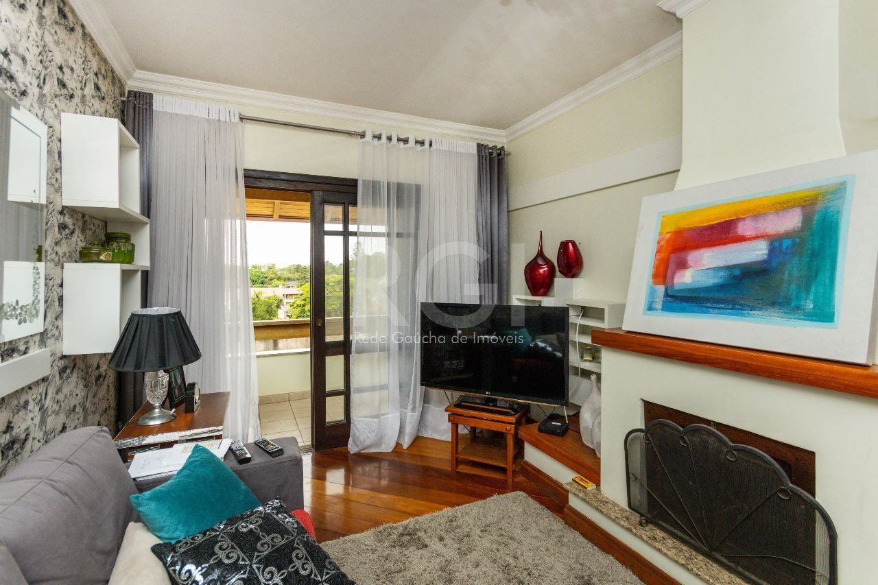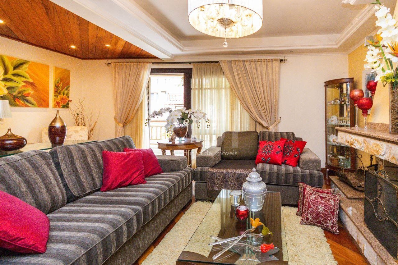 Composta por 3 pavimentos com elevador. Possui 4 dormitórios, sendo 1 suíte com closet, 4 salas, sendo 1 com lareira, escritório, sala de jantar e sala de tv, cozinha ampla com armários e eletrodomésticos, sacada fechada com churrasqueira, adega, banheiro social e lavabo, lavanderia, dependência de empregada e banho auxiliar. Grande salão de festas com churrasqueira e forno a lenha com sala íntima ou dormitório. Pátio grande e garagem fechada para 3 carros.