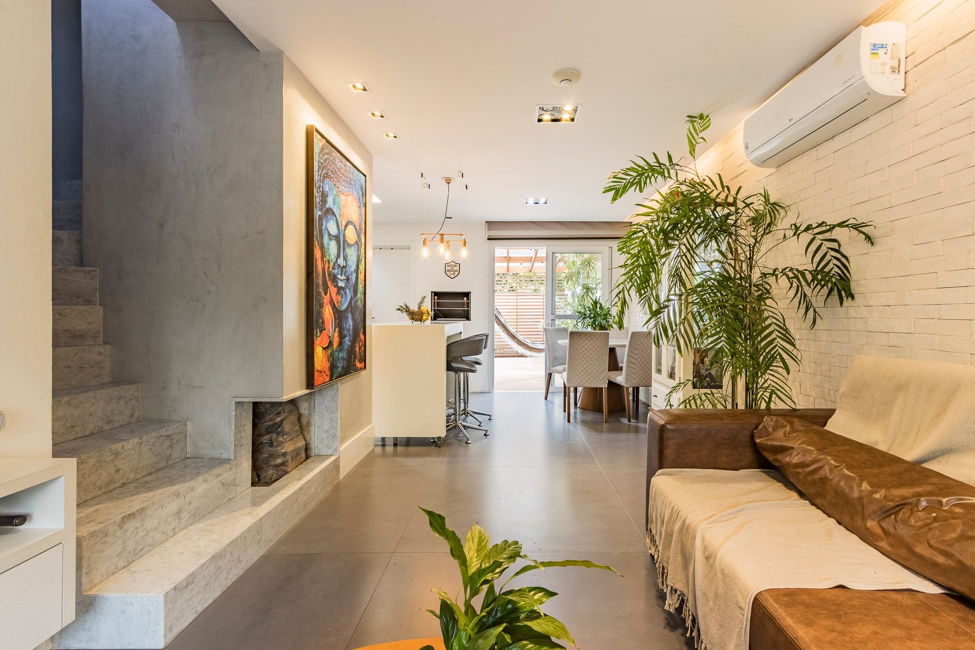 No primeiro pavimento, a sala de estar é integrada à cozinha, criando um ambiente acolhedor e funcional. A casa conta com lareira, churrasqueira, lavabo e uma lavanderia separada, com acesso à cozinha e ao pátio.