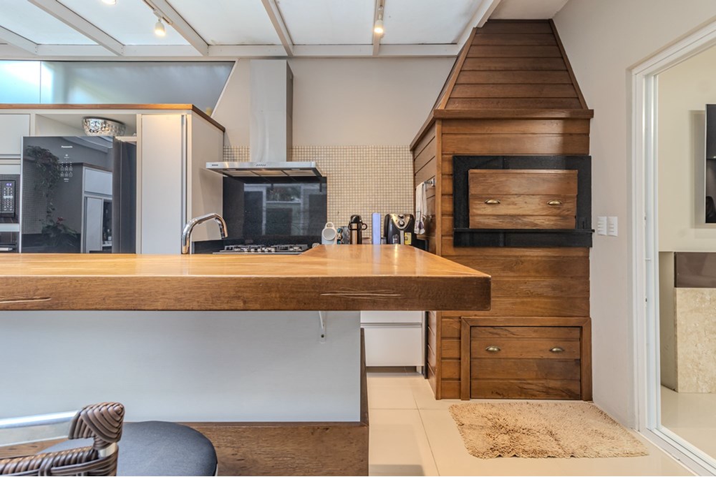 No primeiro pavimento, a casa oferece uma ampla sala com dois ambientes e lareira com acabamento em granito, além de um lavabo. Destaca-se também um aconchegante espaço gourmet, equipado com churrasqueira, forno para pizza em concreto e uma ilha com bancada em granito, perfeito para momentos de confraternização.