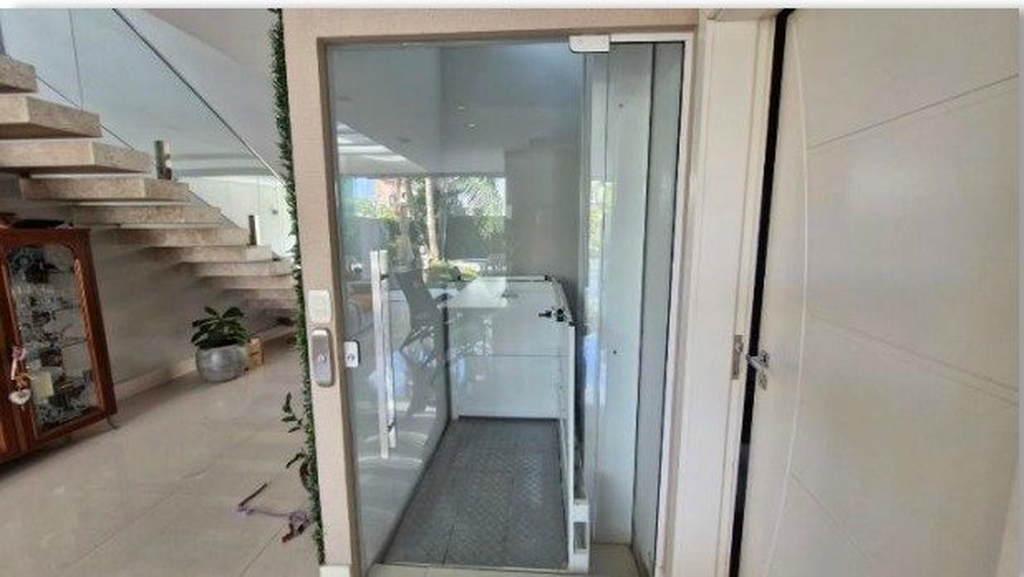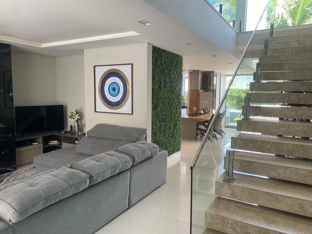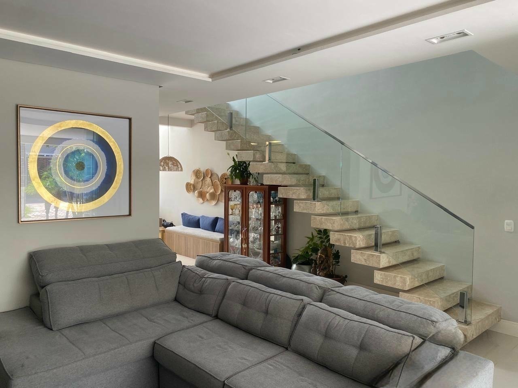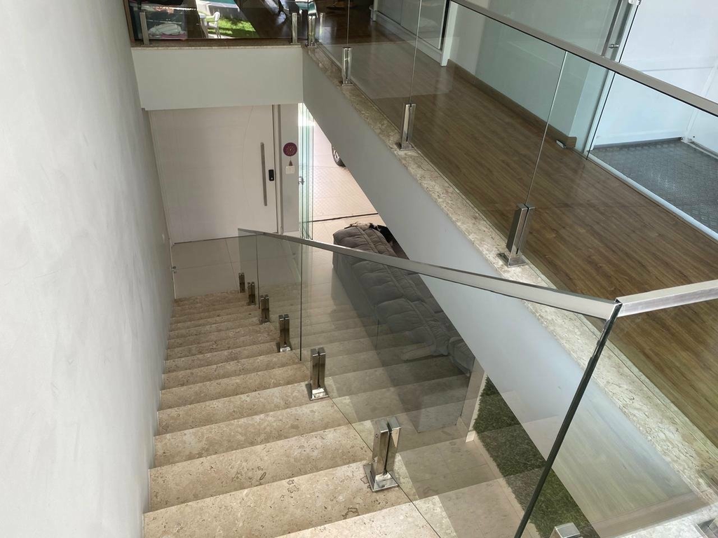 * Arquitetura moderna com claraboias, escada em vidro, marcenaria e pedras naturais.