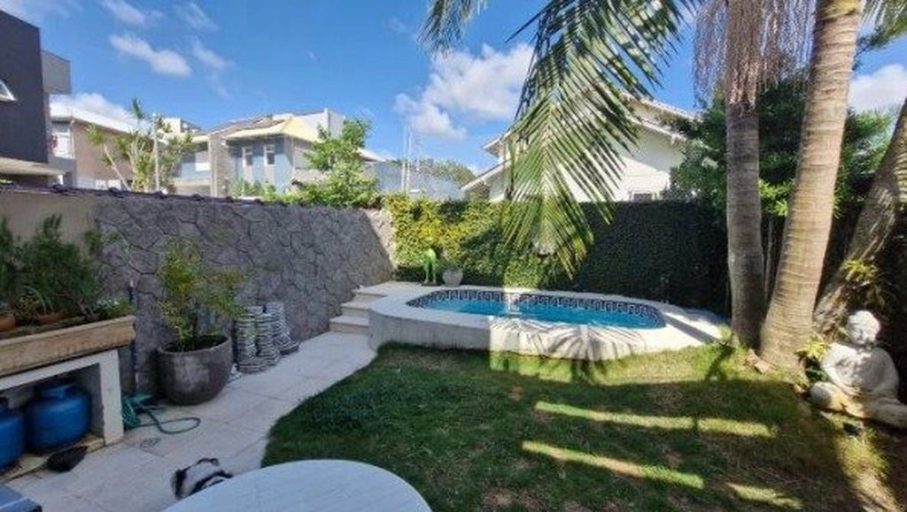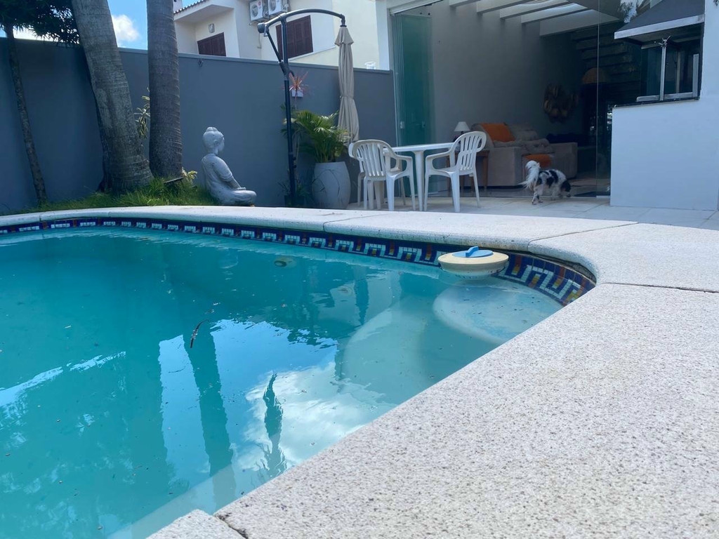 A área de lazer é privativa completa, com piscina, churrasqueira e espaço gramado com coqueiro, proporcionando momentos de convivência e bem-estar.