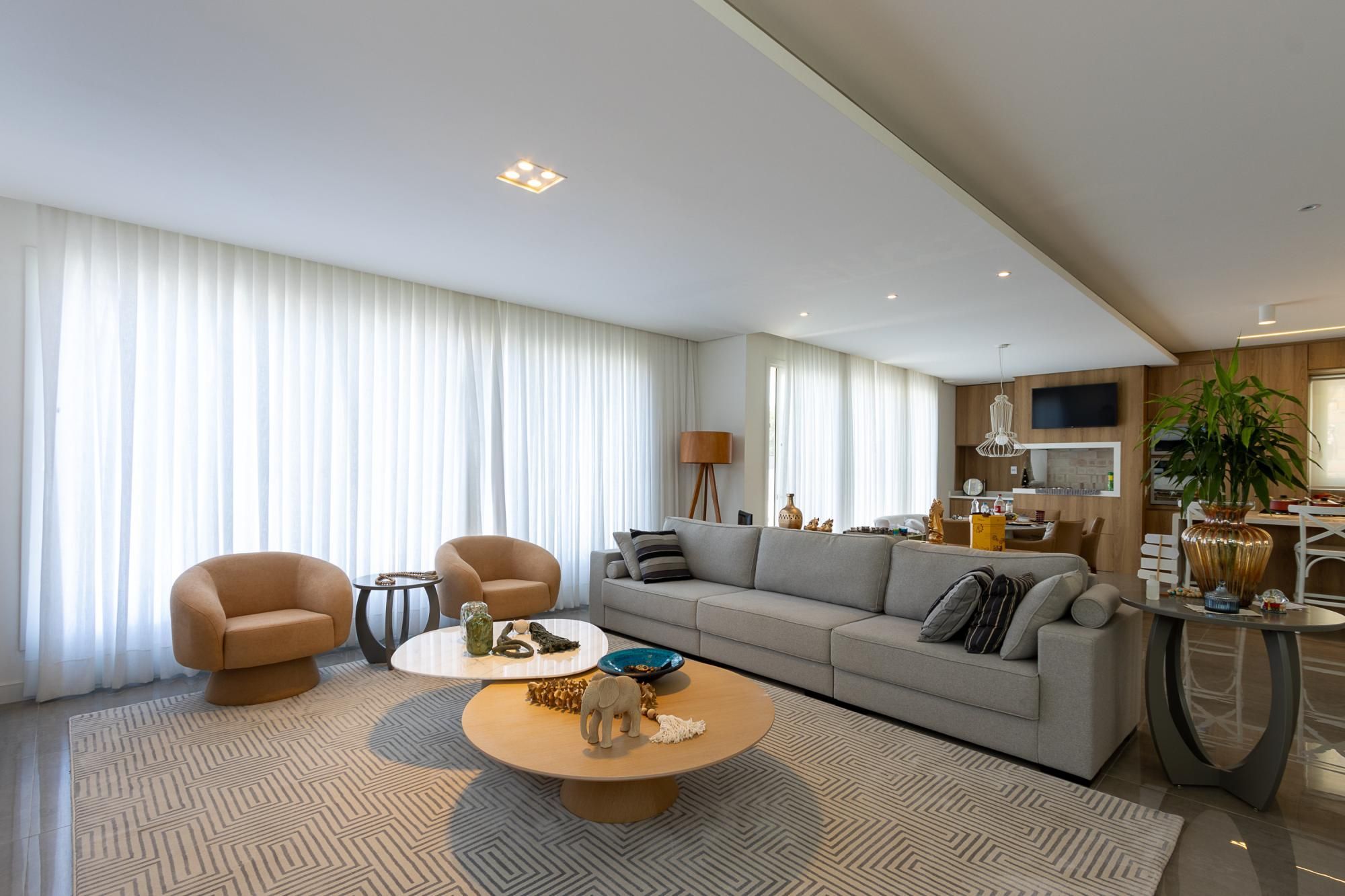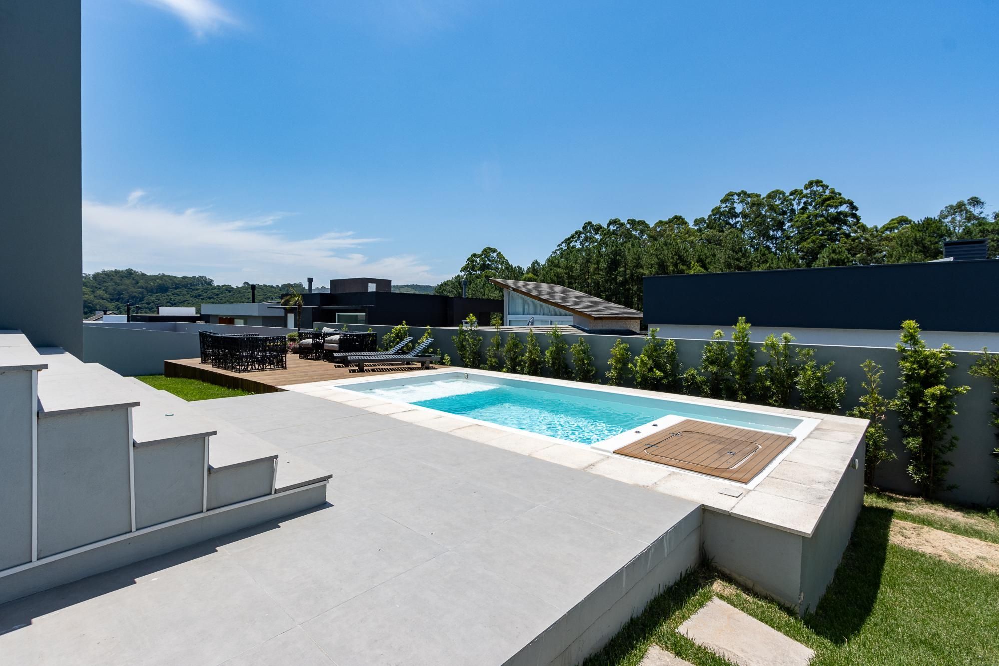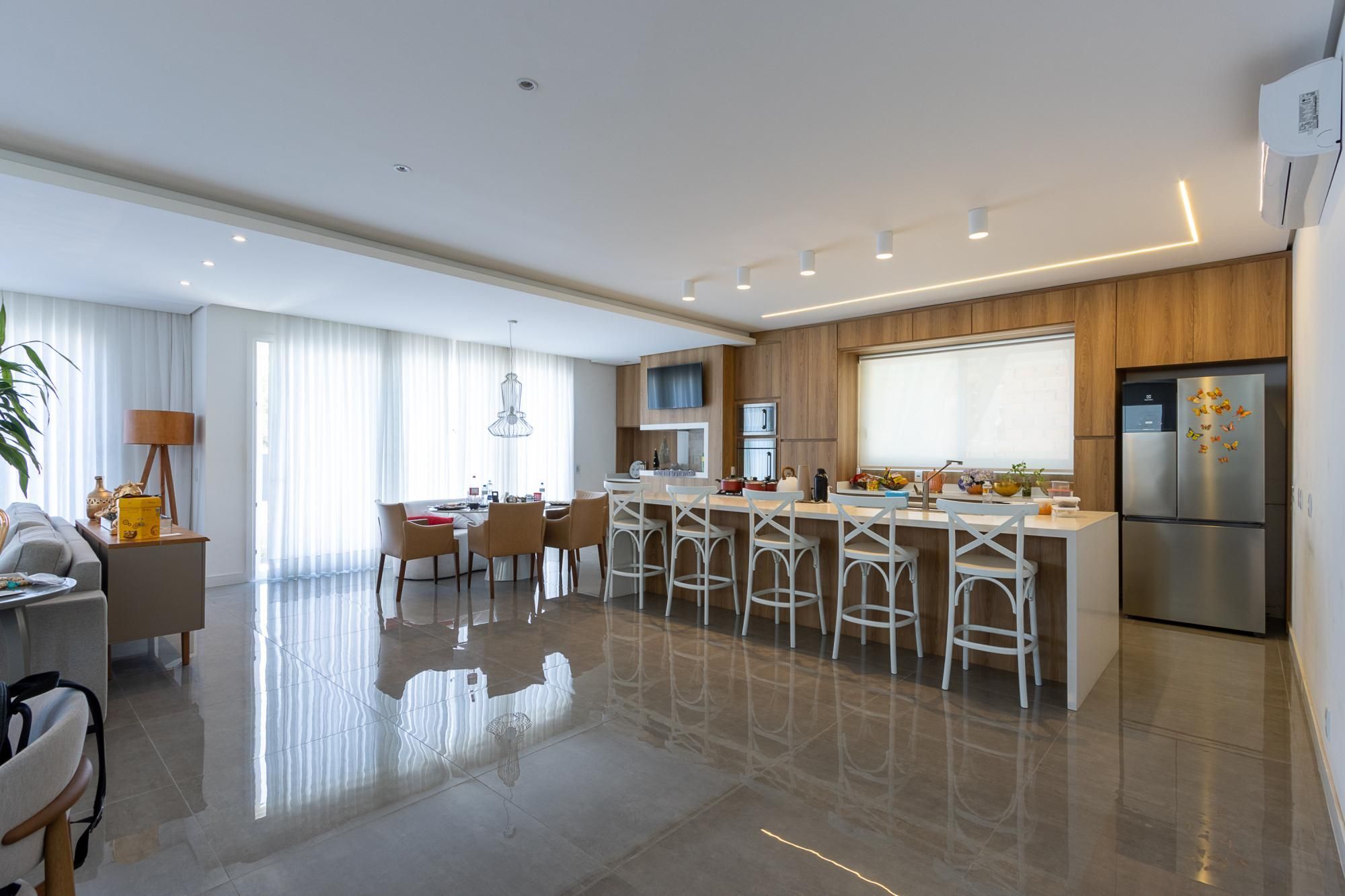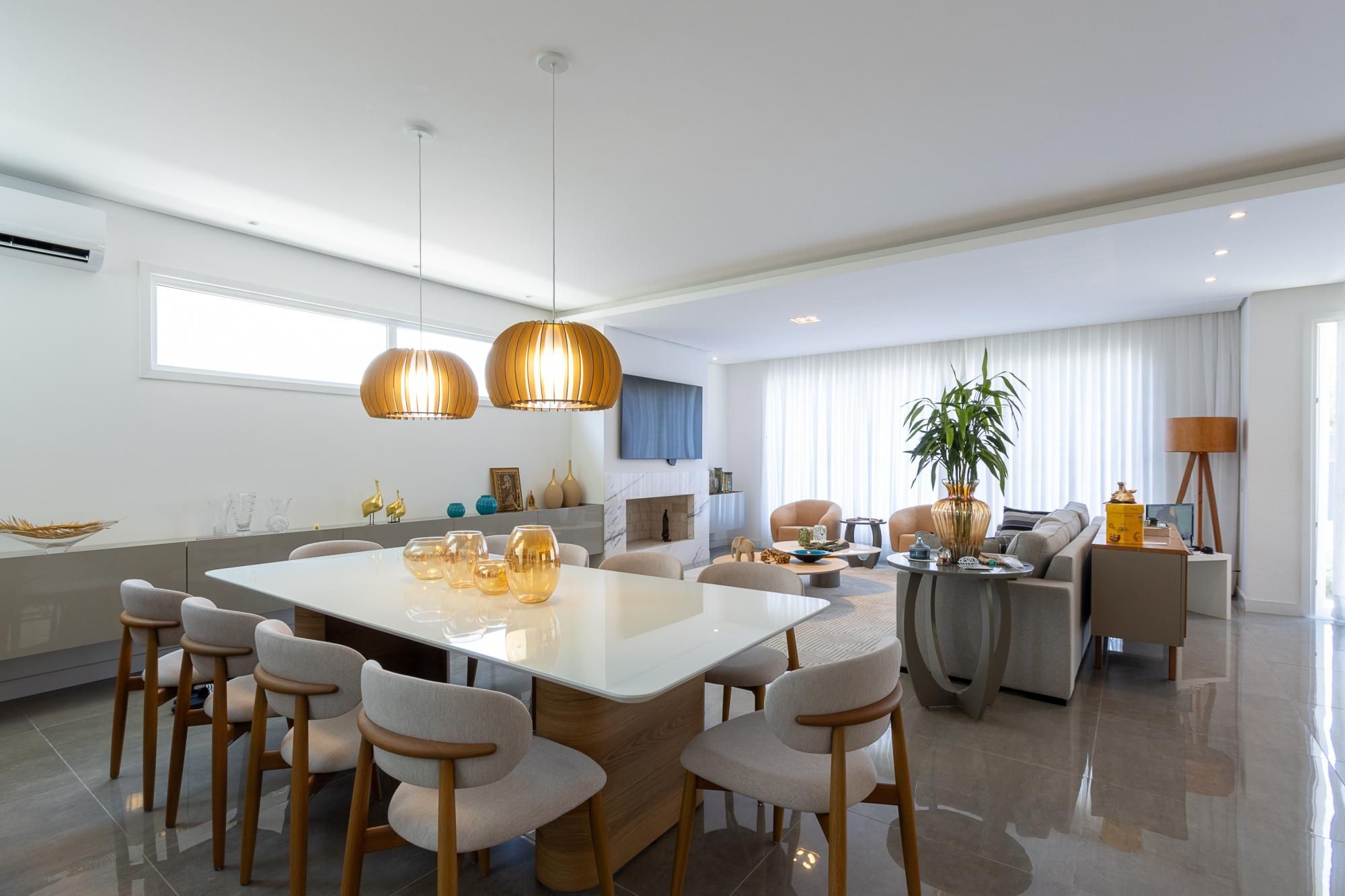 No andar térreo, os ambientes são amplos e integrados, com abertura para o pátio com piscina. Sala de estar com lareira, lavanderia, despensa e um ambiente versátil, ideal para escritório ou suíte térrea.