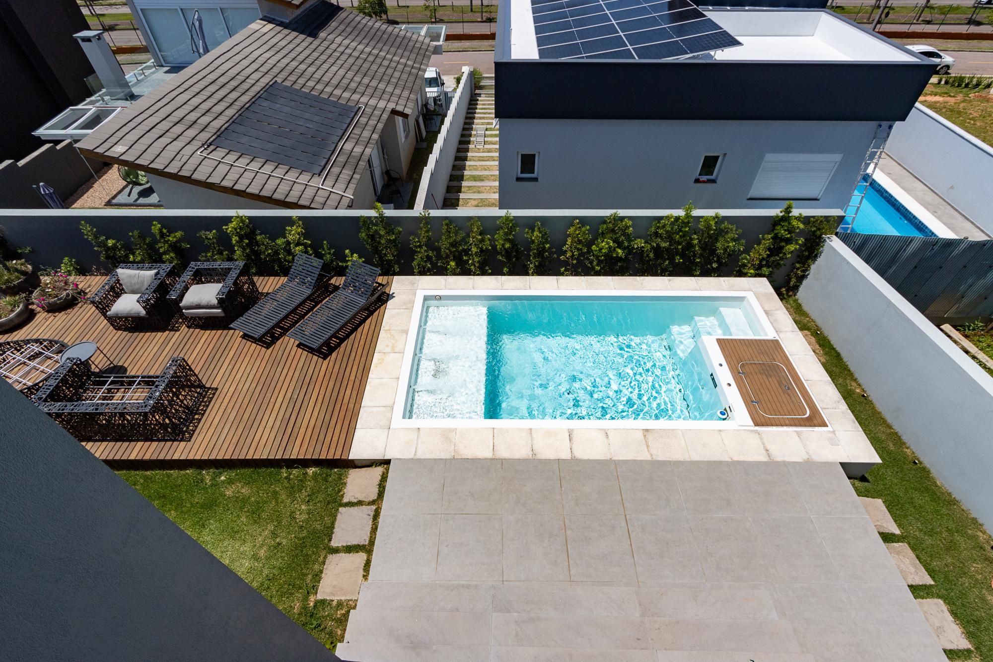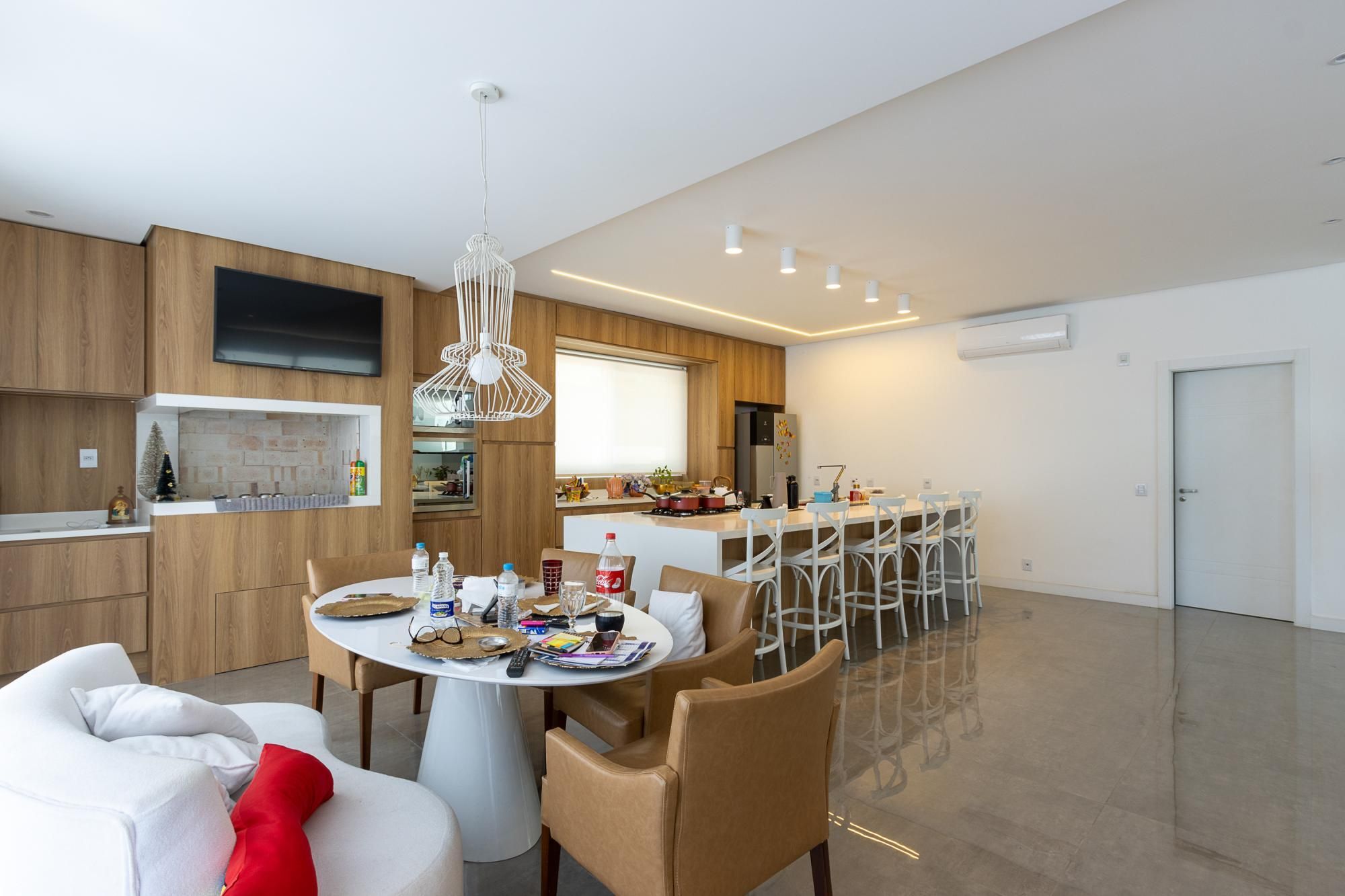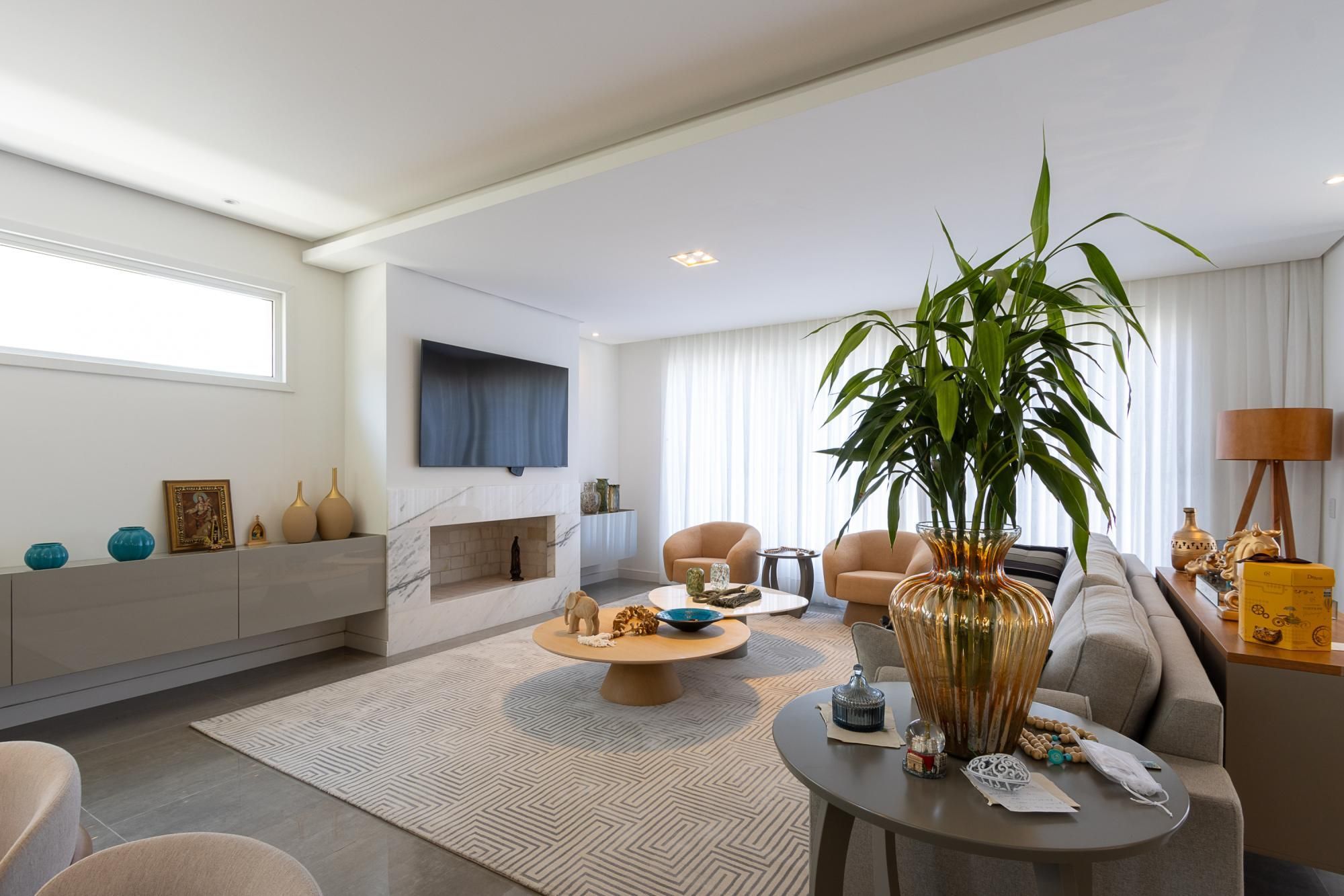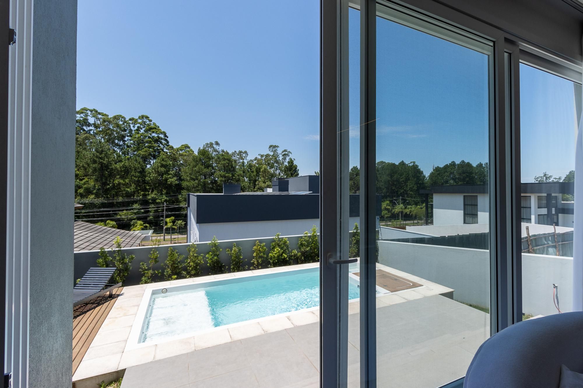 No andar térreo, os ambientes são amplos e integrados, com abertura para o pátio com piscina. Sala de estar com lareira, lavanderia, despensa e um ambiente versátil, ideal para escritório ou suíte térrea.