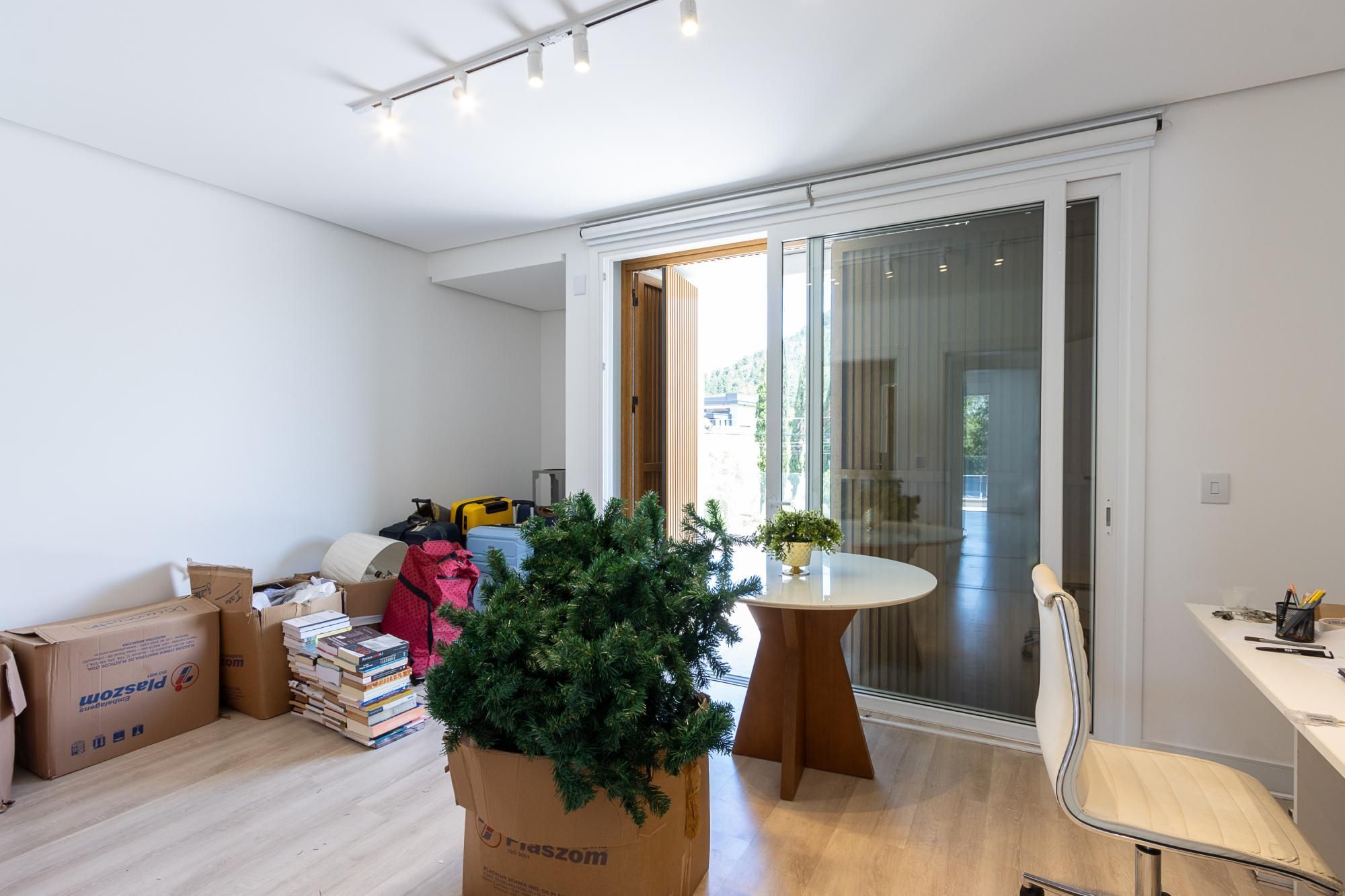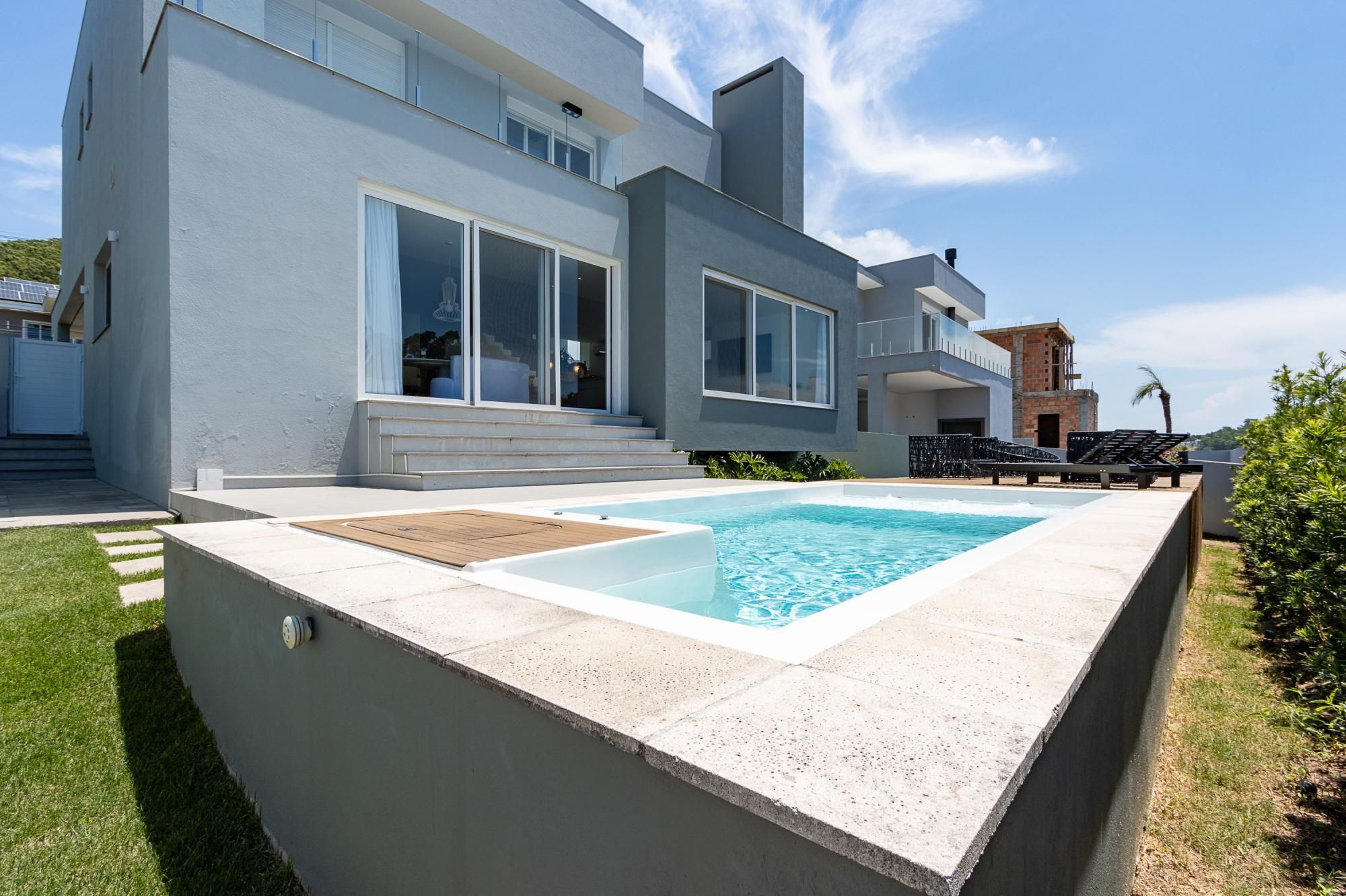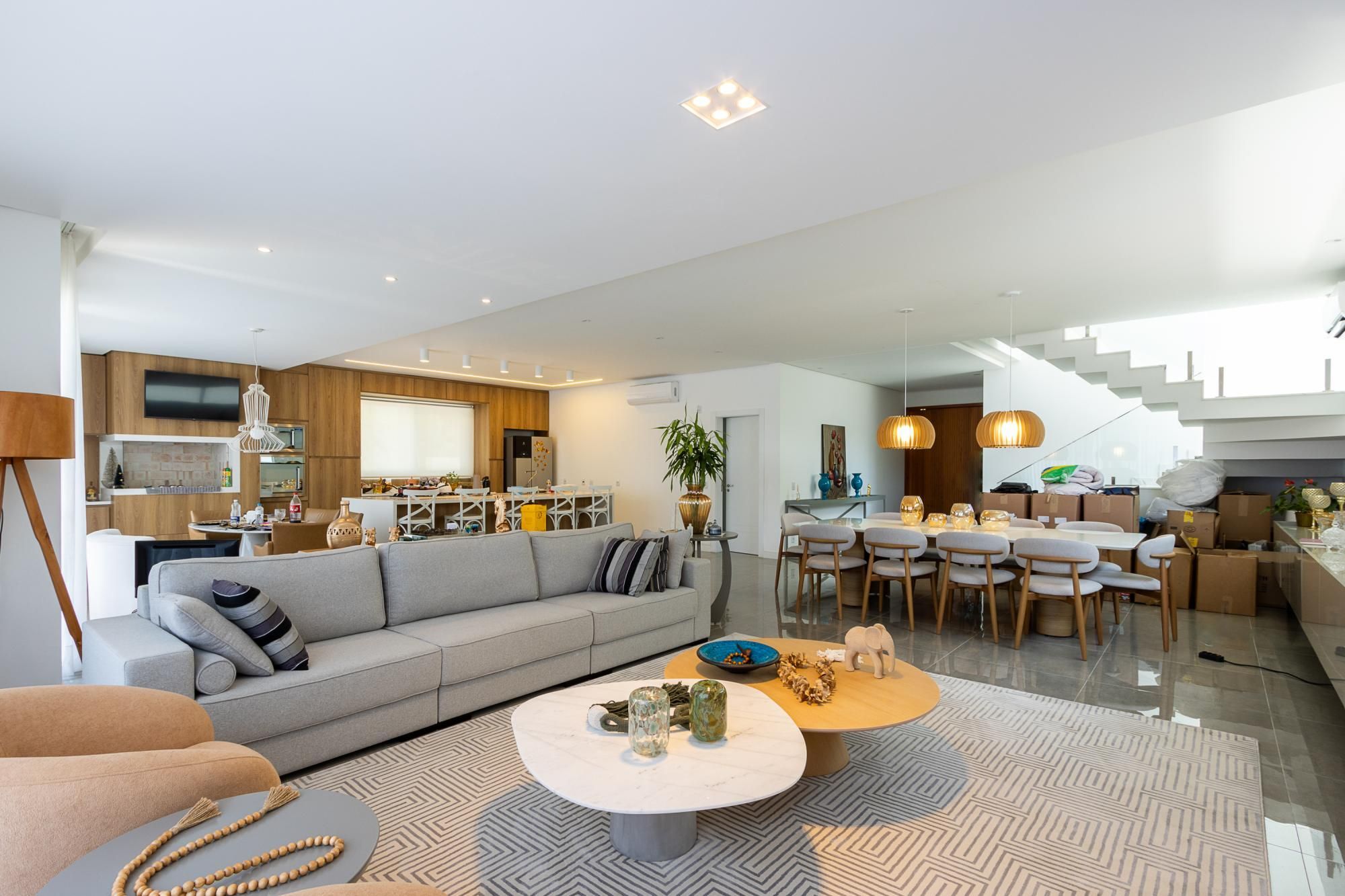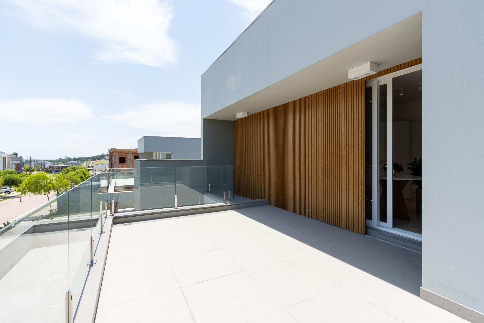 No andar térreo, os ambientes são amplos e integrados, com abertura para o pátio com piscina. Sala de estar com lareira, lavanderia, despensa e um ambiente versátil, ideal para escritório ou suíte térrea.