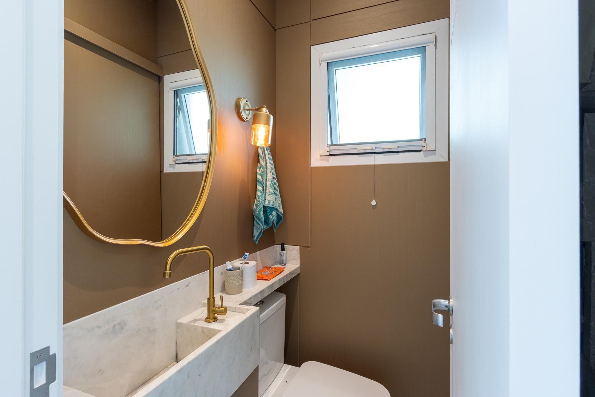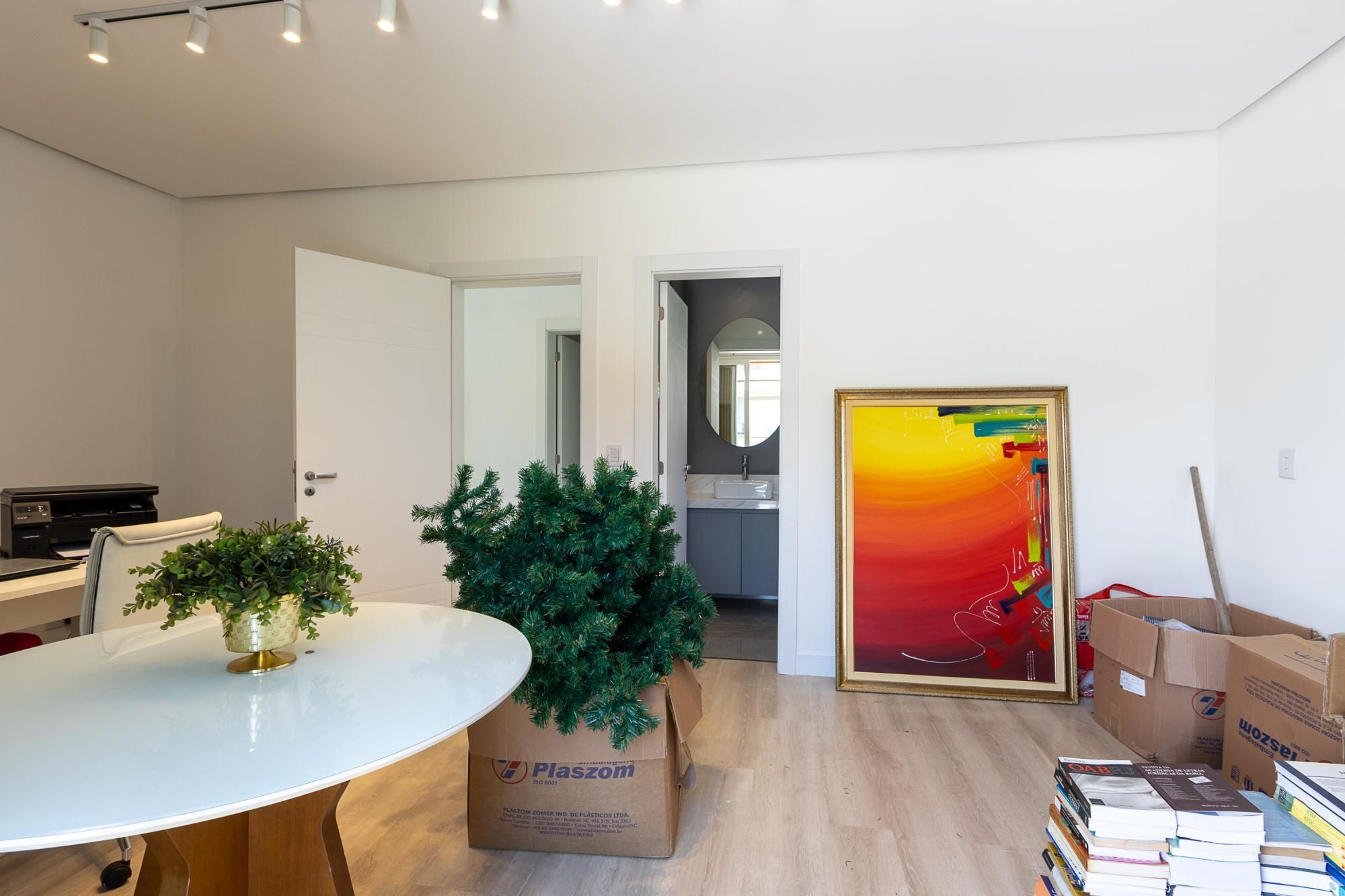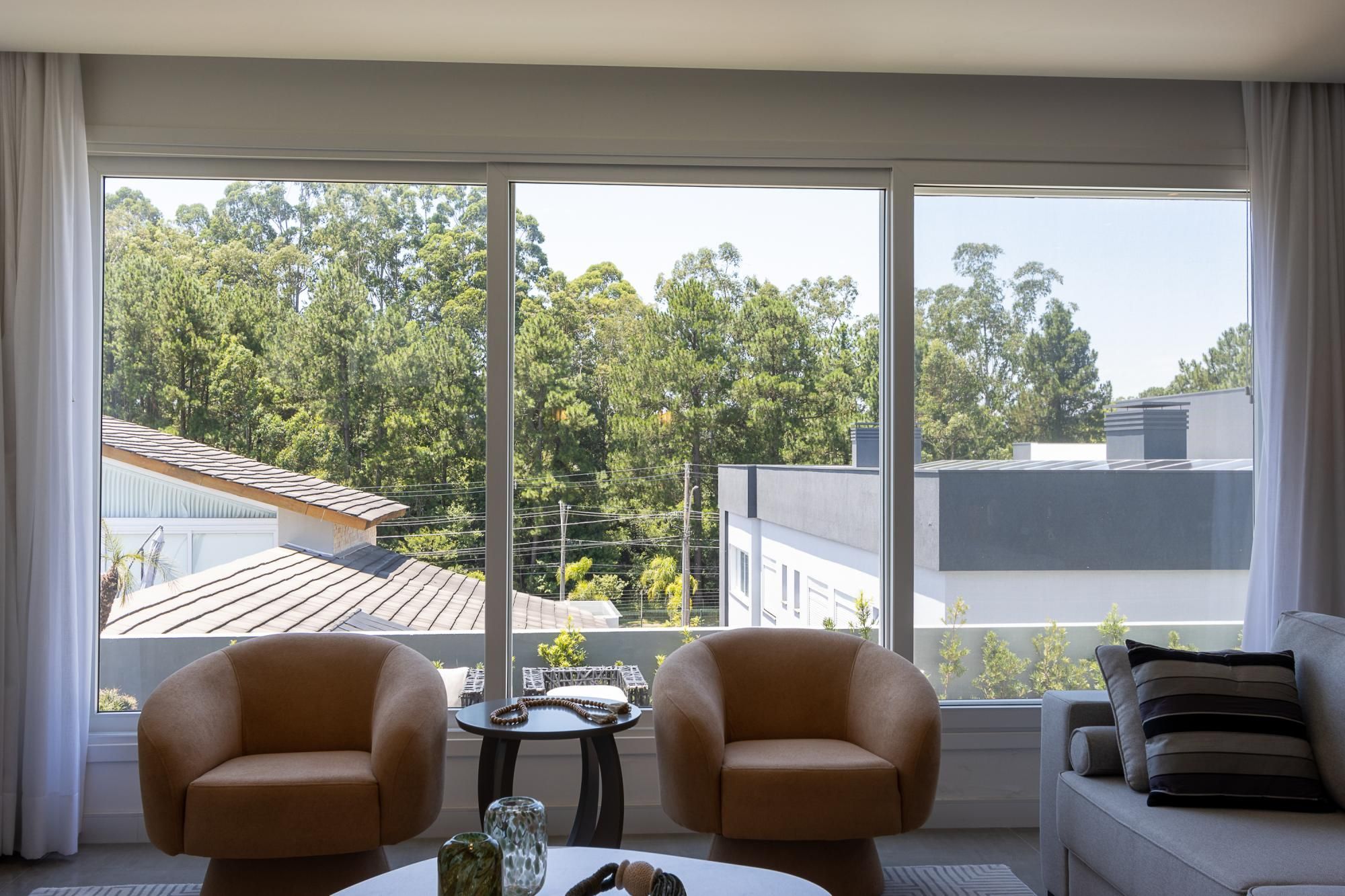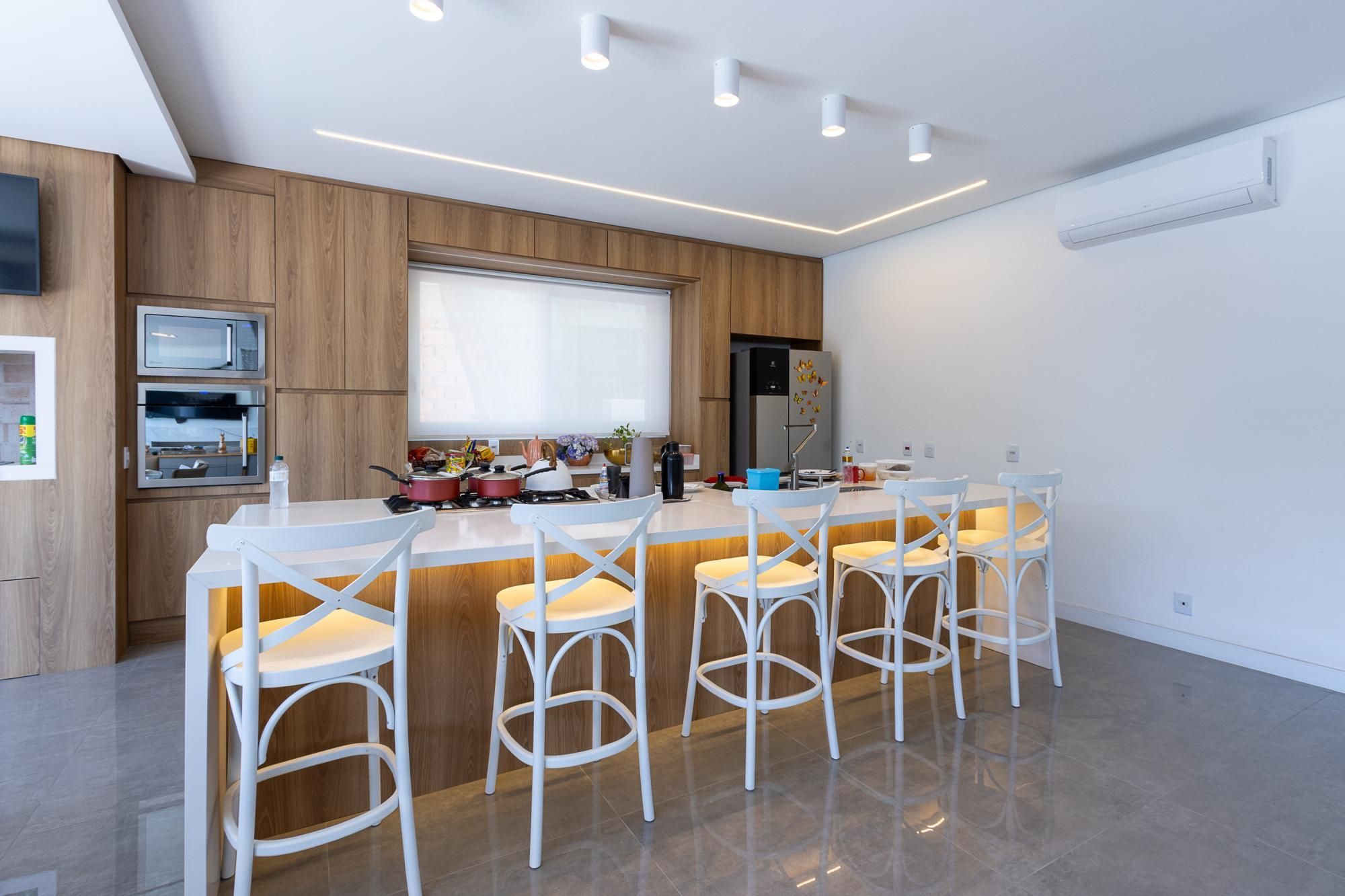 No andar térreo, os ambientes são amplos e integrados, com abertura para o pátio com piscina. Sala de estar com lareira, lavanderia, despensa e um ambiente versátil, ideal para escritório ou suíte térrea.