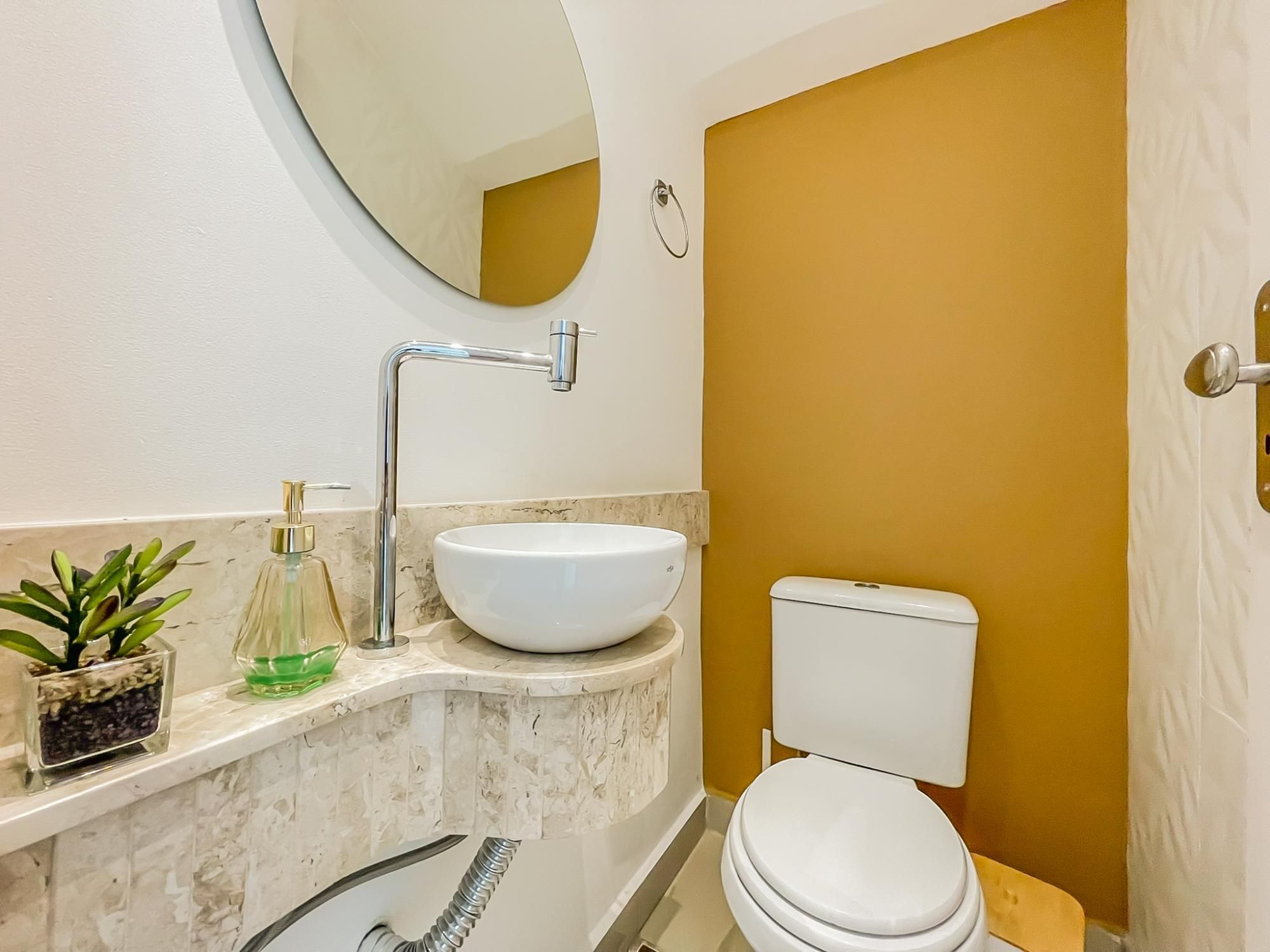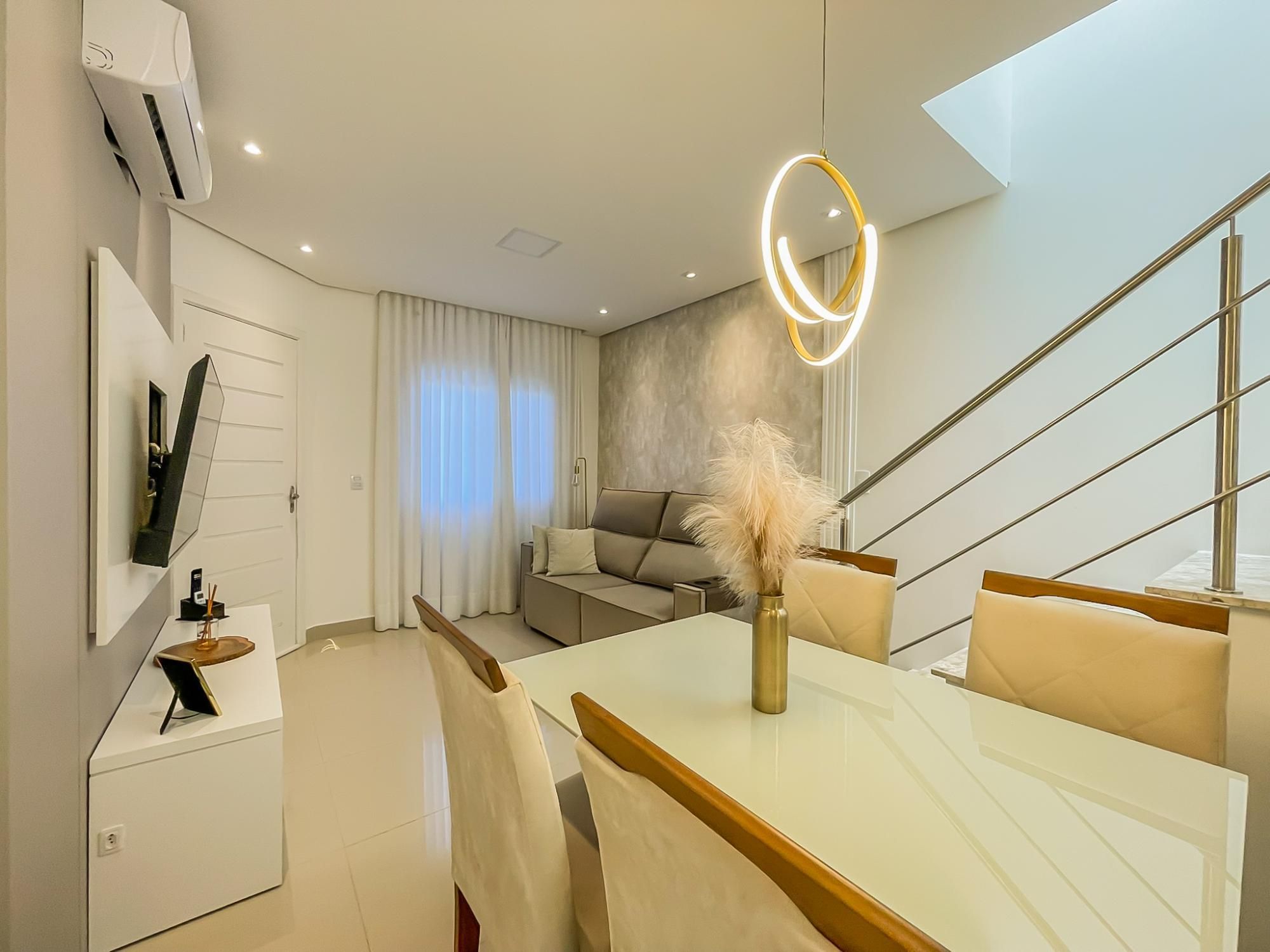 A residência possui uma ampla variedade de comodidades, incluindo área de serviço, banheiro social, estar social, lavabo, cozinha equipada, armários embutidos, aquecimento a gás, portão eletrônico, interfone, ar condicionado, sala de estar e jantar, móveis planejados, e acesso asfaltado.