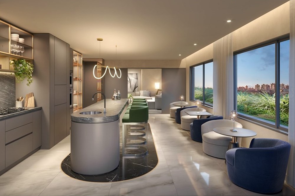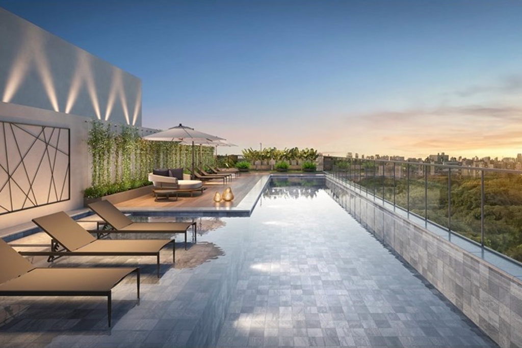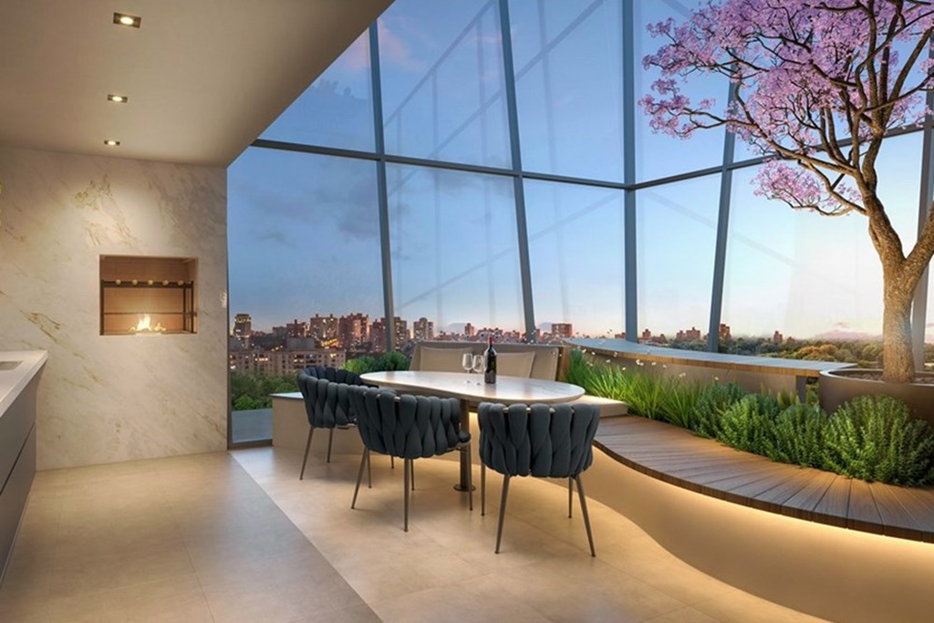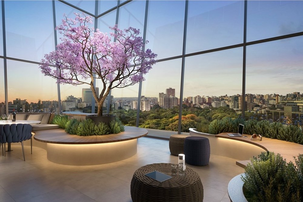 O rooftop é um verdadeiro refúgio urbano - lounge externo com paisagismo, salão de festas, espaço gourmet, pool house, piscina com deck molhado e o grande destaque: Skyglass Lounge - um mirante envidraçado em formato de cubo, com vista panorâmica para a cidade e o Parcão, criando uma verdadeira conexão entre arquitetura e natureza.